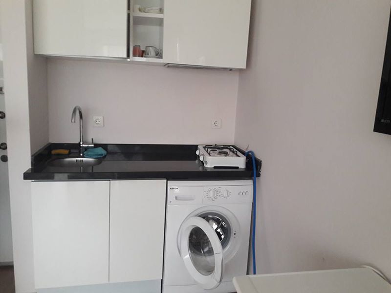 The total area of the studio is 40 sq. m.: Living room with open-plan kitchen - sofa, table and chairs, bedroom area (double bed) and closet + bathroom.