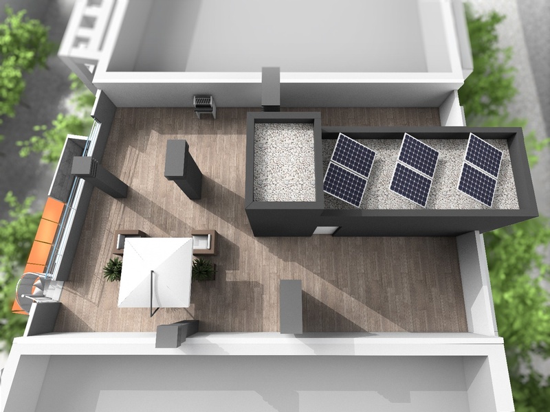 Эксклюзивный пентхаус площадью 254м2 с отдельным входом (только собственник может подняться на 6-ой этаж) имеет собственный крытый гараж, оборудованный солярий с летней кухней, душ и озеленение, красивый вид на окрестности.