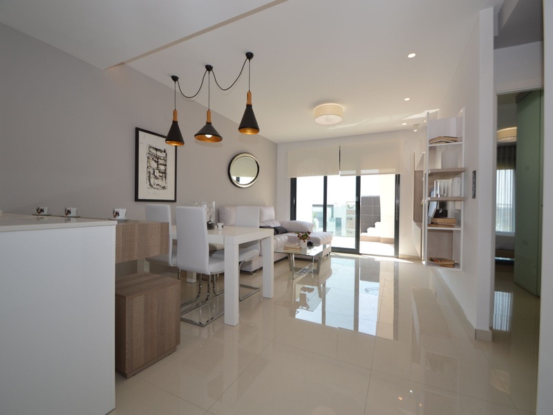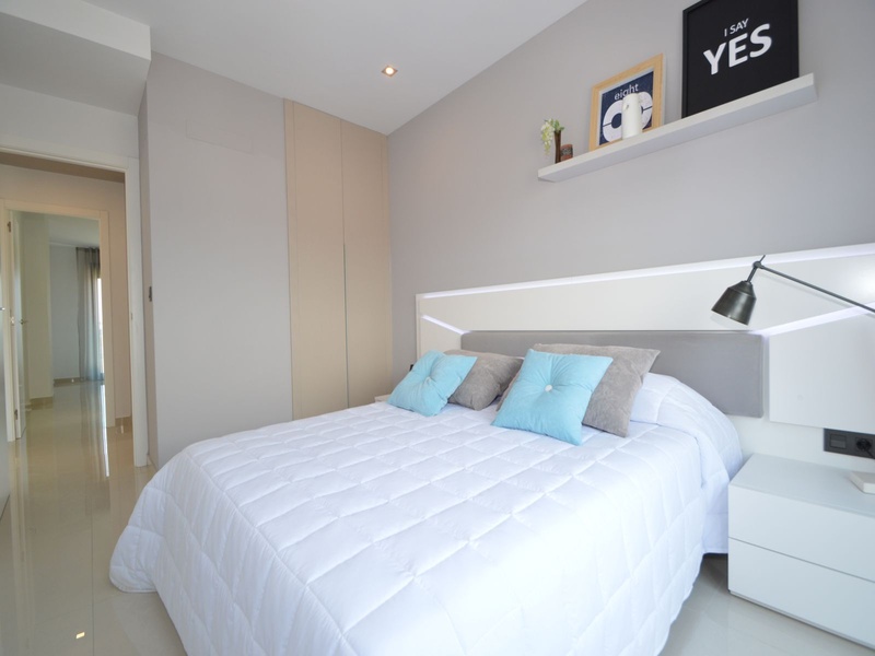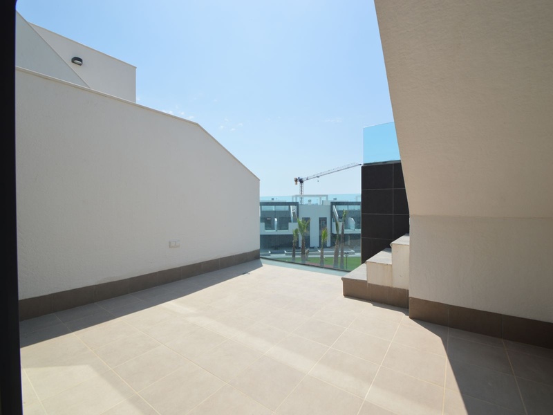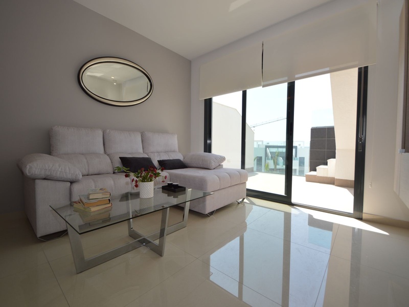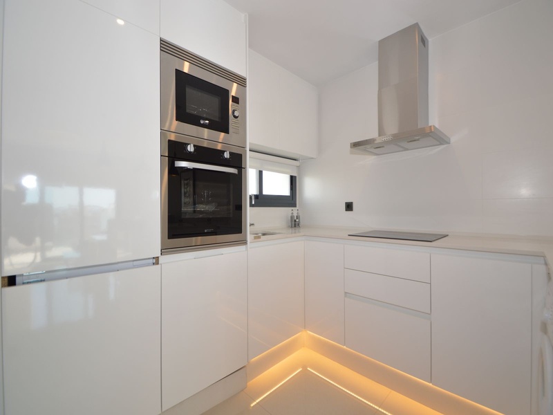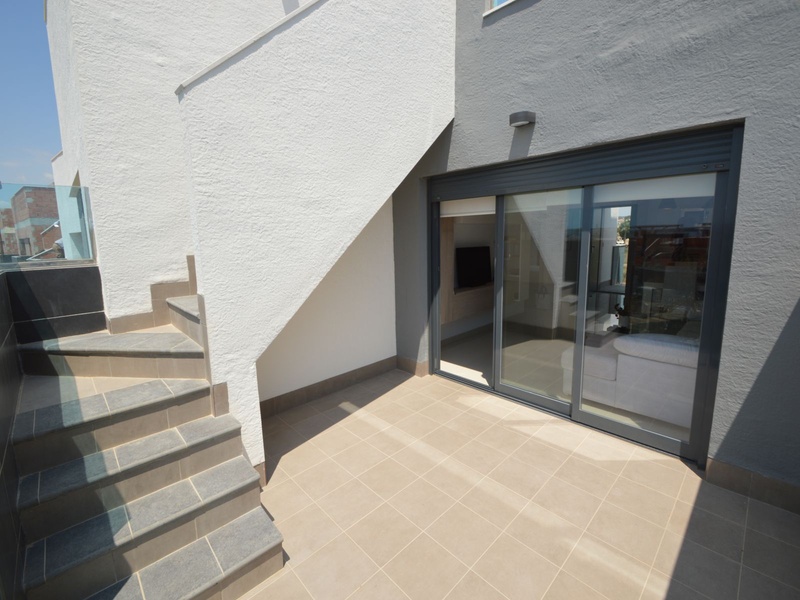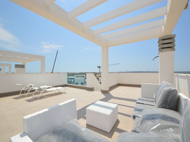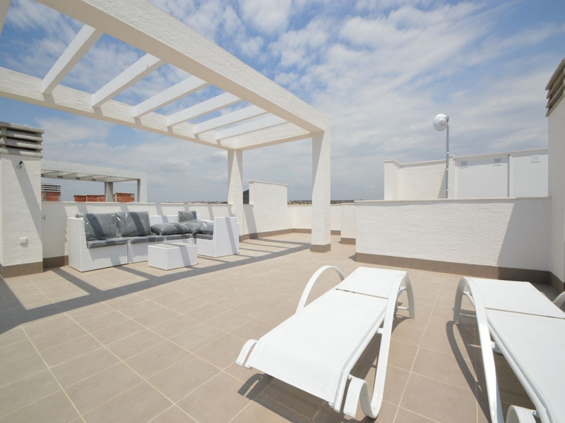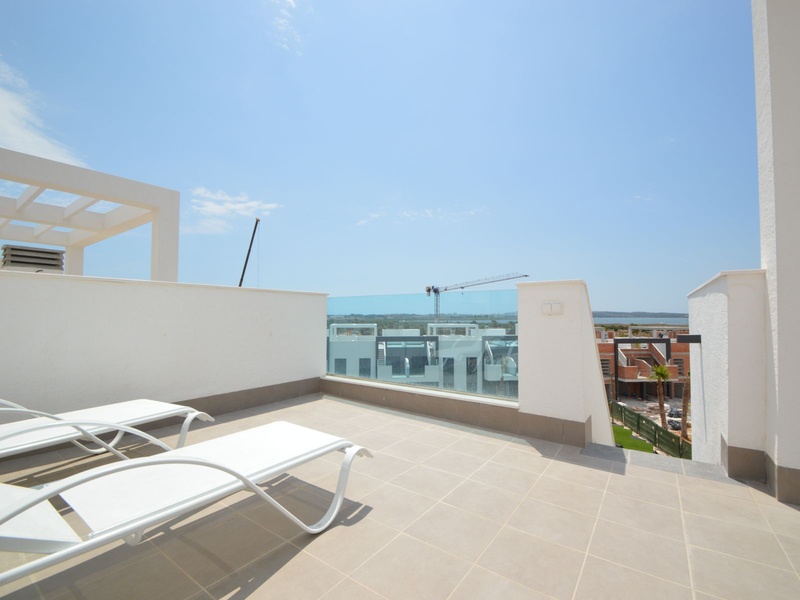 Contemporary housing with a built surface area of 85,51 square meters, distributed between 2 bedrooms, 2 bathrooms, american kitchen, a living room, 1 storage room and a large terrace. It has a solarium of 64 square meters. Fully fitted kitchen and bathrooms, fitted wardrobes in both bedrooms, pre-installation of air conditioning and underground parking space - all included in the price. It is located on the top floor of a private 3 floors residential complex, which is a part of a gated community with large landscaped areas, swimming pools, spa and sports area. A very quiet area, but with all the amenities possible. Only 5 kilometers far from Guardamar del Segura with its white sandy beaches, and 10 kilometers far from Torrevieja. In close proximity to shopping centers, supermarkets, the market of Guardamar and several leisure areas for all tastes.