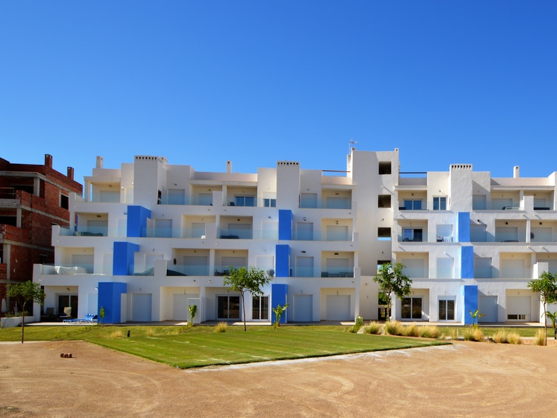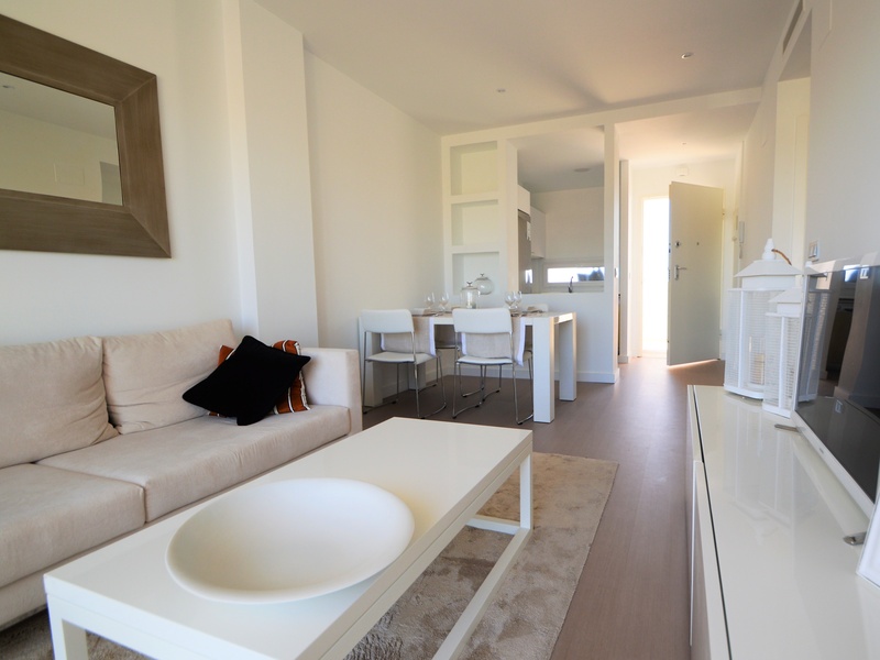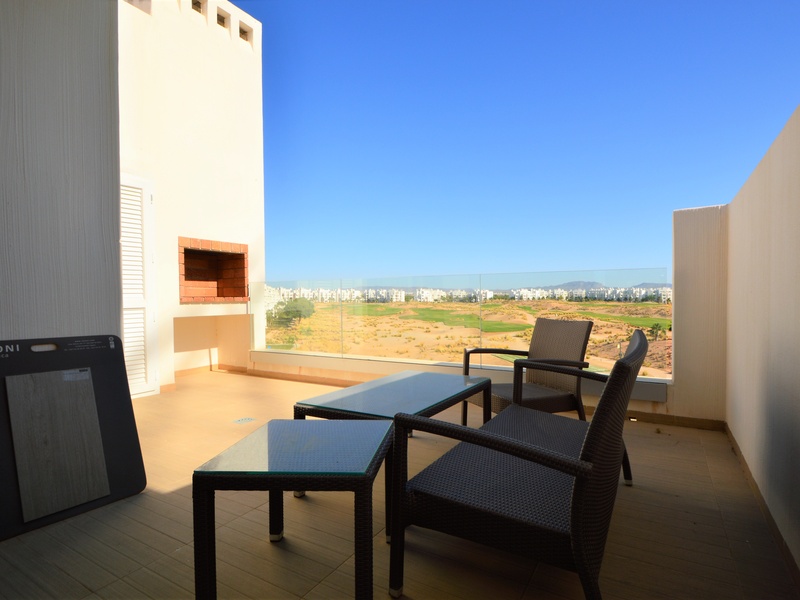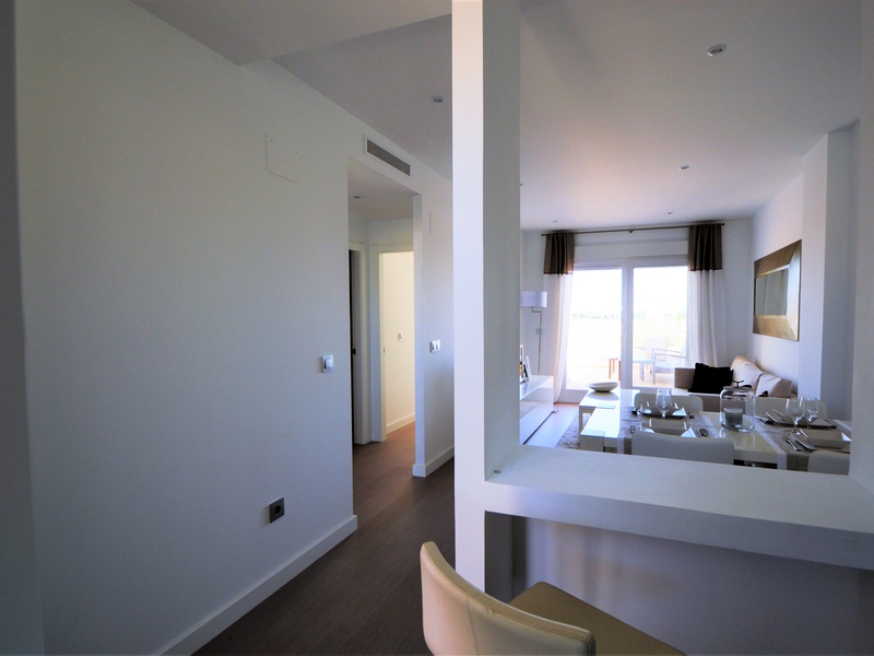 Brand new 2 bedrooms apartment for sale on the first line of the golf courses Las Terrazas de La Torre. With a total built surface area of 85,80 square meters which includes a terrace of 18,10 square meters. The apartment disposes of 2 bedrooms, 1 bathroom, a living room, a kitchen and a parking space. With the kitchen and the bathroom fully furnished and equipped, with air conditioning by ducts, armored entrance door and fitted wardrobes in both bedrooms. The double orientation of the apartment makes it very bright and provides with unique views to the golf courses from all the windows. The apartment is located in a building that forms part of a private residential complex with communal swimming pools, an outdoor parking and a solarium. The complex is located inside the golf resort with 24 hour surveillance and all services within the resort. The price of the apartment described is 99,900 € and there are 5 properties left for sale of the same type and at the same price. In total there are 19 apartments for sale of new construction that will be finished in September of 2017. The photos correspond to the showhouse.