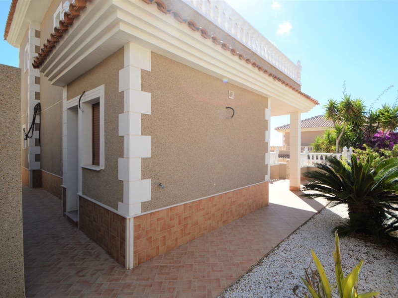 3 bedrooms independent villa with a classic design. The built surface area consists of 106 square meters. The house is located on a plot of 225 square meters with a parking space. A large living room, a separate kitchen, one bathroom and one bedroom are located on the ground floor, two bedrooms and another bathroom occupy the second floor. The villa dispose of pre-instalation of central heating and air conditioning, the kitchen and the bathrooms are fully furnished and equipped, there are built-in wardrobes in the bedrooms . The villa also comes fully furnished (the price includes a set of furniture, which, moreover, assumes the possibility to be changed to satisfy the tastes and needs of the buyer). The villa is located on a private street with security gates and is part of a closed community with a shared swimming pool.