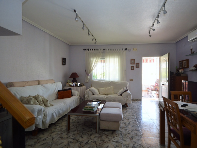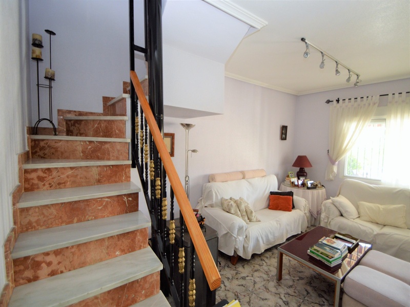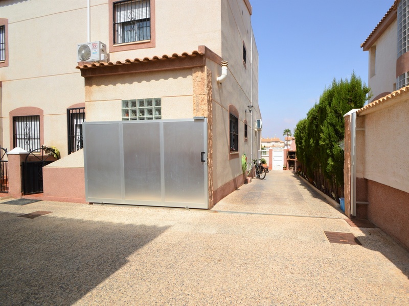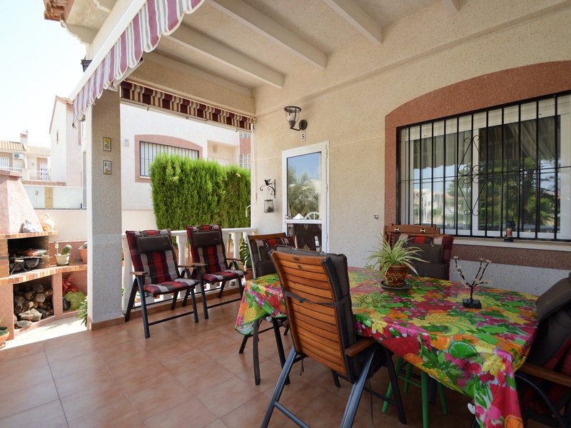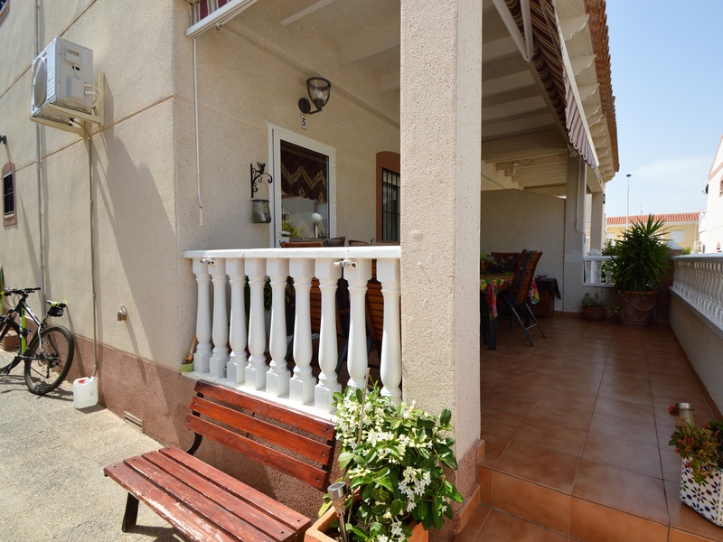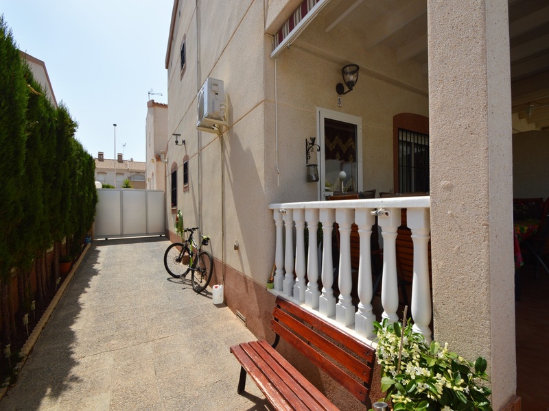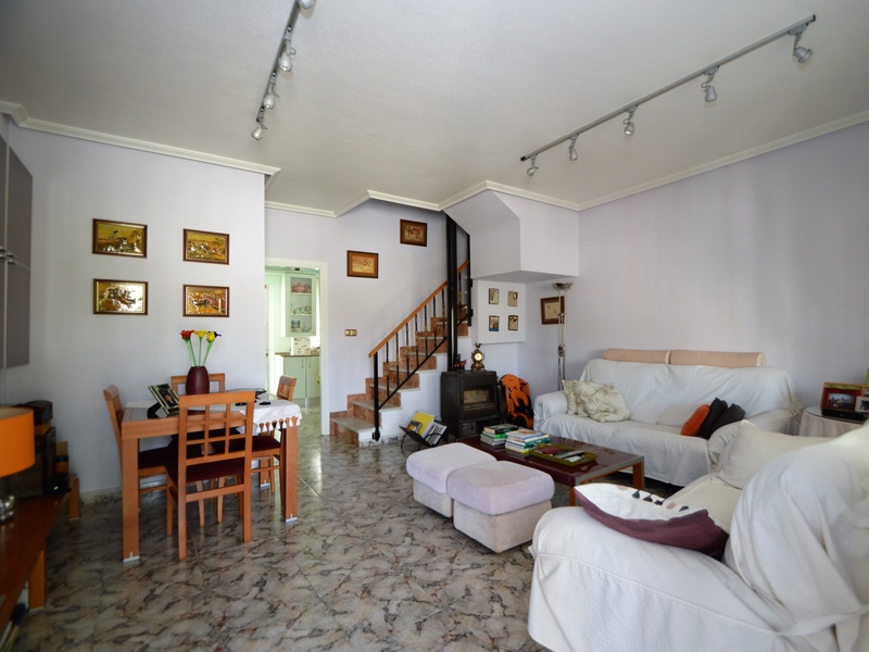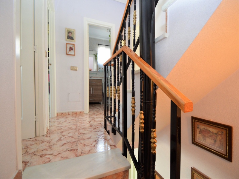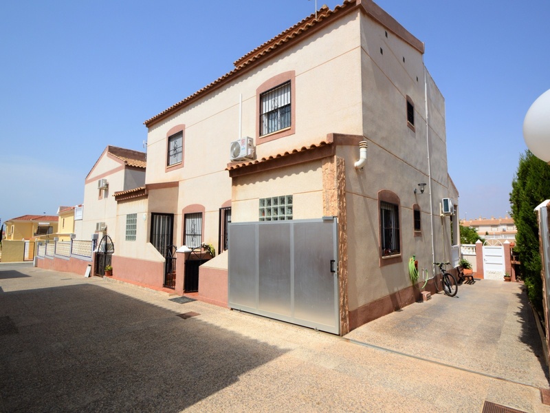 A semi-detached duplex, consisting of 3 bedrooms, 2 bathrooms, a spacious living room, a large separate kitchen with a dining area, a laundry, a porch and a terrace. It is located on a plot of 110 square meters of a surface area with a parking space for two cars. The house is in a very good condition and has all the amenities: air conditioning, wood heating, gas water heater, built-in wardrobes, dressing room, armoured main entrance door, security grills throughout the house, barbecue. Excellent location on a dead-end street and overlooking the park with a children's playground. Very quiet and familiar area, but with a very well-developed infrastructure, with all kinds of services. Within a 2-minute walk are various supermarkets, pharmacies, restaurants, cafes and bars. In close proximity to public schools and institutes, Torrevieja municipal sports centre, shopping centres, commercial areas, etc. Just 10 minutes from the best beaches in Torrevieja.