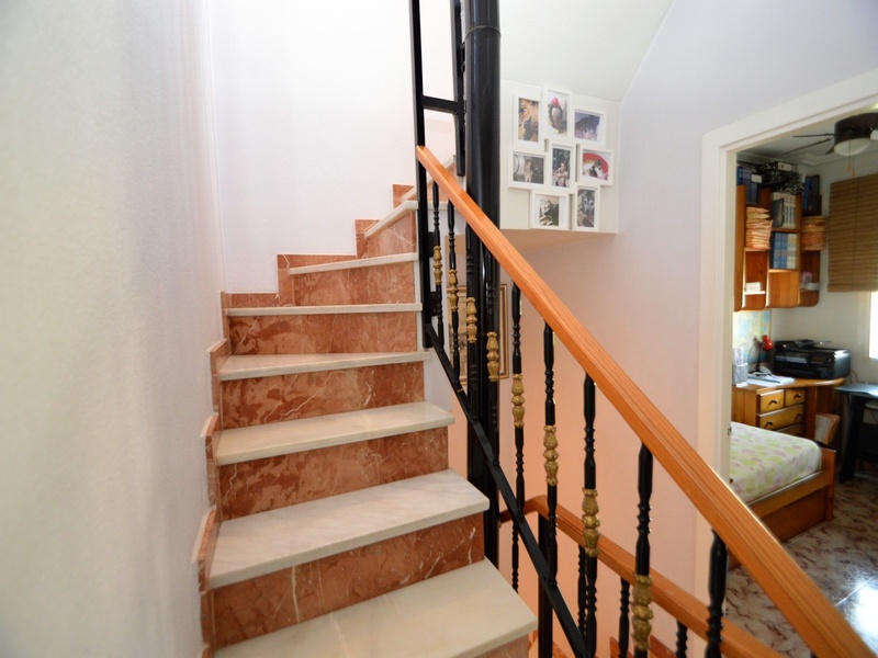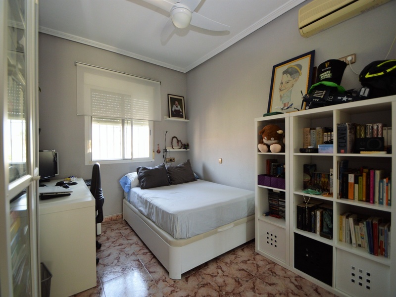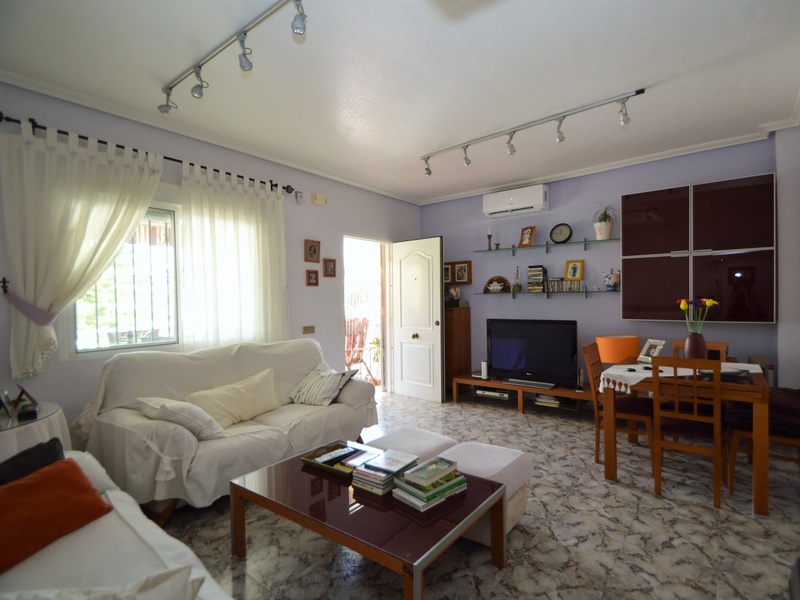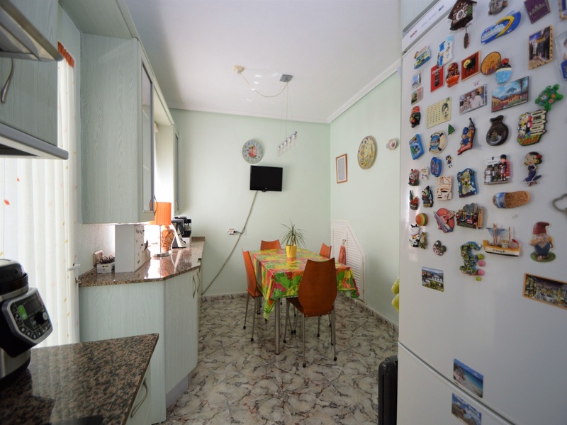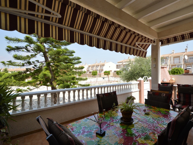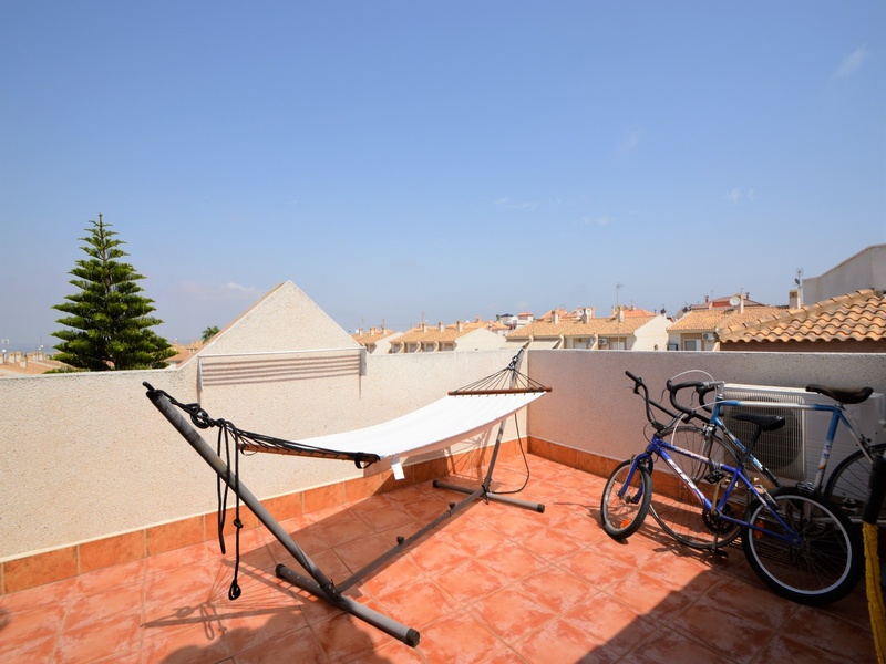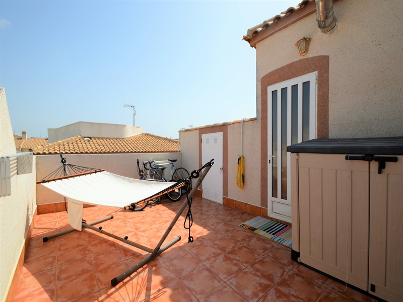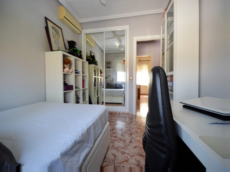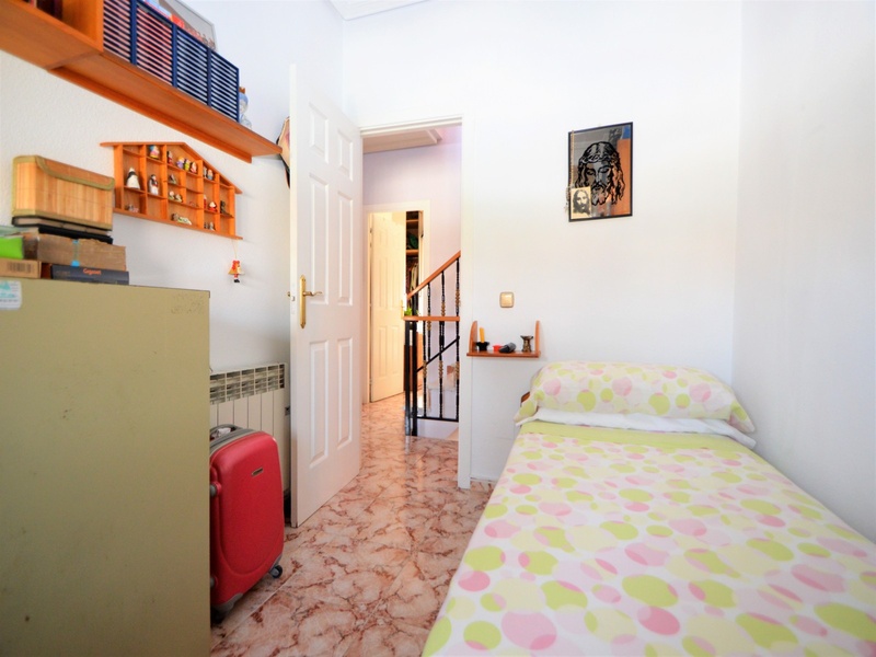 A semi-detached duplex, consisting of 3 bedrooms, 2 bathrooms, a spacious living room, a large separate kitchen with a dining area, a laundry, a porch and a terrace. It is located on a plot of 110 square meters of a surface area with a parking space for two cars. The house is in a very good condition and has all the amenities: air conditioning, wood heating, gas water heater, built-in wardrobes, dressing room, armoured main entrance door, security grills throughout the house, barbecue. Excellent location on a dead-end street and overlooking the park with a children's playground. Very quiet and familiar area, but with a very well-developed infrastructure, with all kinds of services. Within a 2-minute walk are various supermarkets, pharmacies, restaurants, cafes and bars. In close proximity to public schools and institutes, Torrevieja municipal sports centre, shopping centres, commercial areas, etc. Just 10 minutes from the best beaches in Torrevieja.