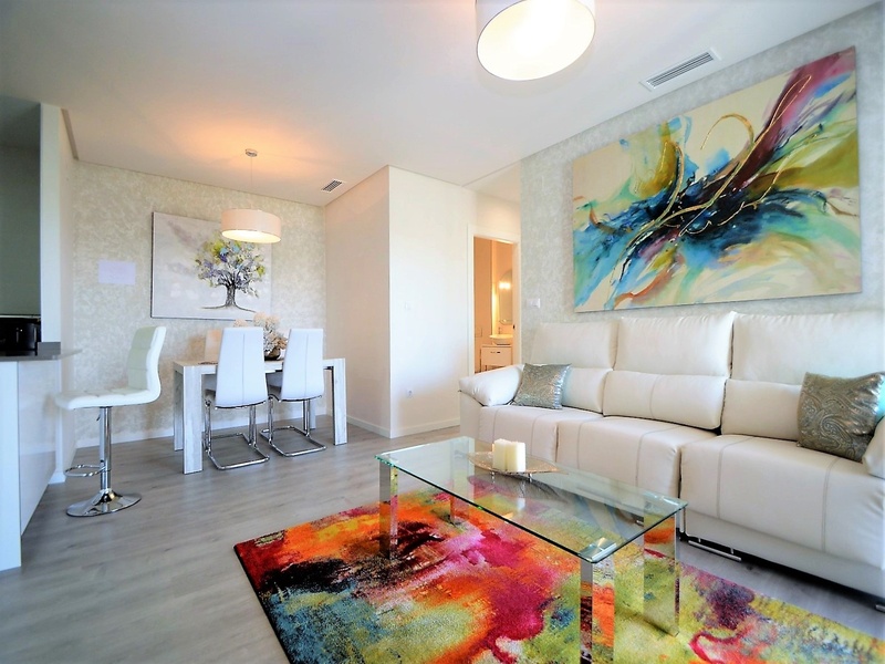 Ground floor apartment of new construction of a 5-floors building. The apartment consists of 2 bedrooms, 2 bathrooms, a living room with an american kitchen and a terrace of 47.34 square meters of a surface area. The apartments disposes of built-in wardrobes, fully furnished and equipped with white goods kitchen and bathrooms, telephone and television installations with optical fiber, heated floors in the bathrooms, heating, air conditioning and hot water with renewable energy, an armoured main entrance door, double glazing and aluminum shutters. The housing complex consists of 7 blocks and disposes of common gardens, children's playground area, swimming pools, an indoor spa, a gym and an underground parking. Is is located between La Zenia and Villa Martin. The best beaches of the area, the golf courses of Villa Martin, shopping centres, sports centres, schools, seaport, etc. are within less than 10-minutes driving distance.