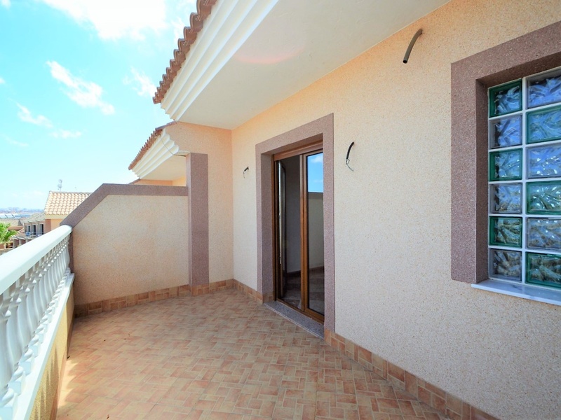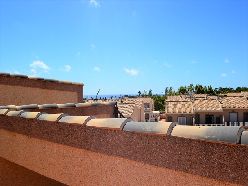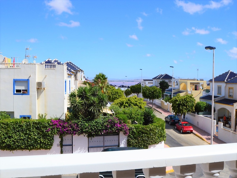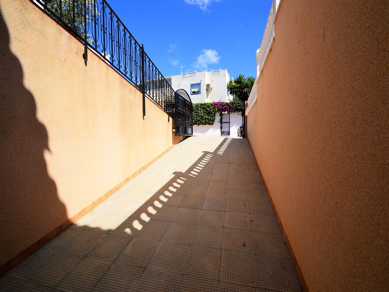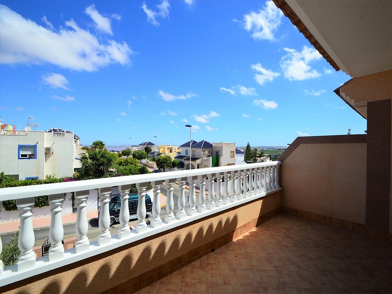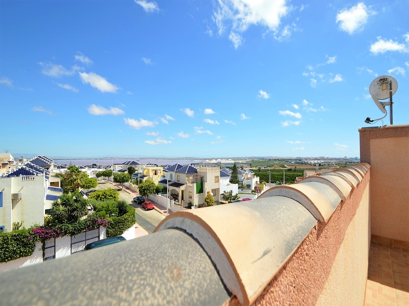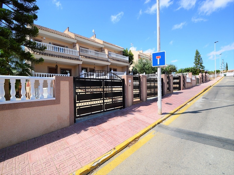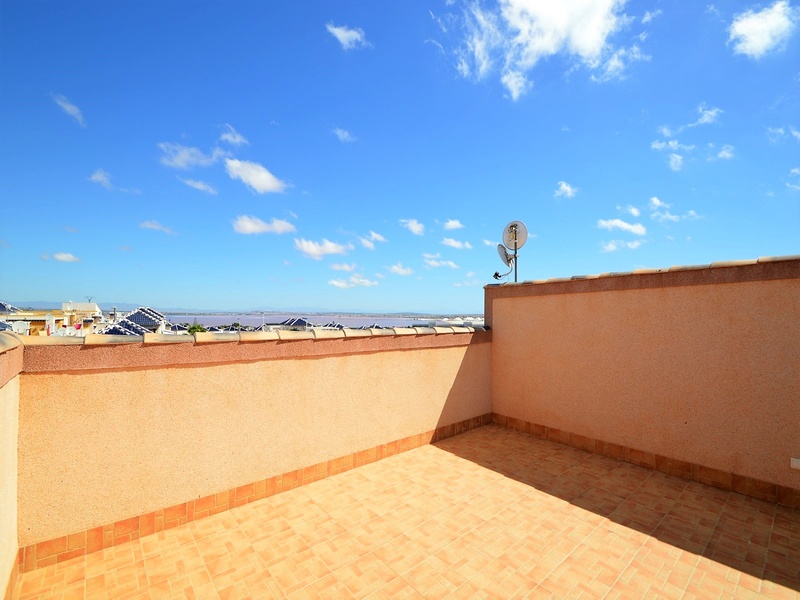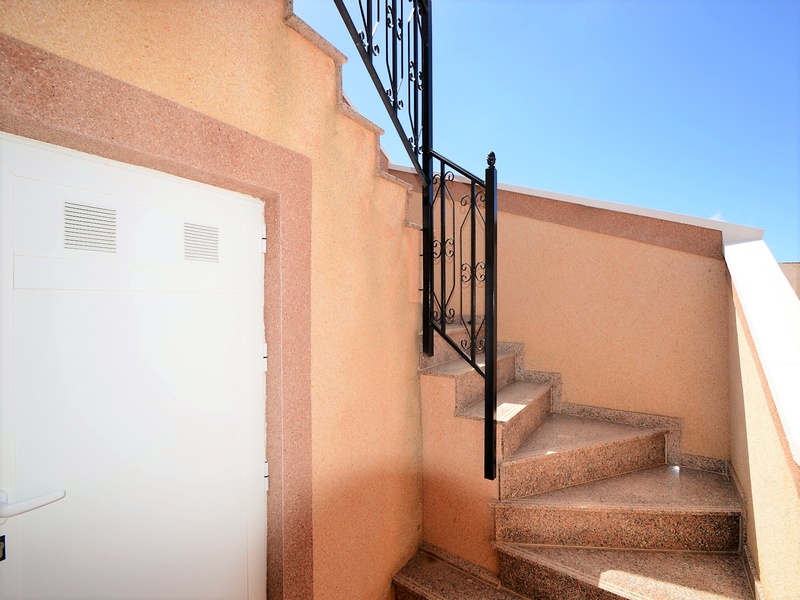 Semi-detached duplex with a built surface area of 162 square meters, divided between a large living room, a separate kitchen, 2 bedrooms, 3 bathrooms, 1 room and a garage on the basement floor, a porch, a behind terrace overlooking the community swimming pool and a large private solarium on the roof of the house. The property has a pre-installation of air conditioning and central heating, built-in wardrobes, fully furnished and equipped with white goods kitchen and bathrooms. In addition, a package of furniture (which is possible to modify according to the tastes and needs of the buyer) is included in the price of the property. The house is located on a plot of 140 square meters and is located on a dead-end street. Within 10 minutes driving to the city of Torrevieja and the best beaches in this area. Within walking distance to several supermarkets, restaurants, pharmacies, Torrevieja’s main hospital, a public school and various recreation areas. It is a central model of the block of three attached houses. The photos correspond to the lateral model of the same block.