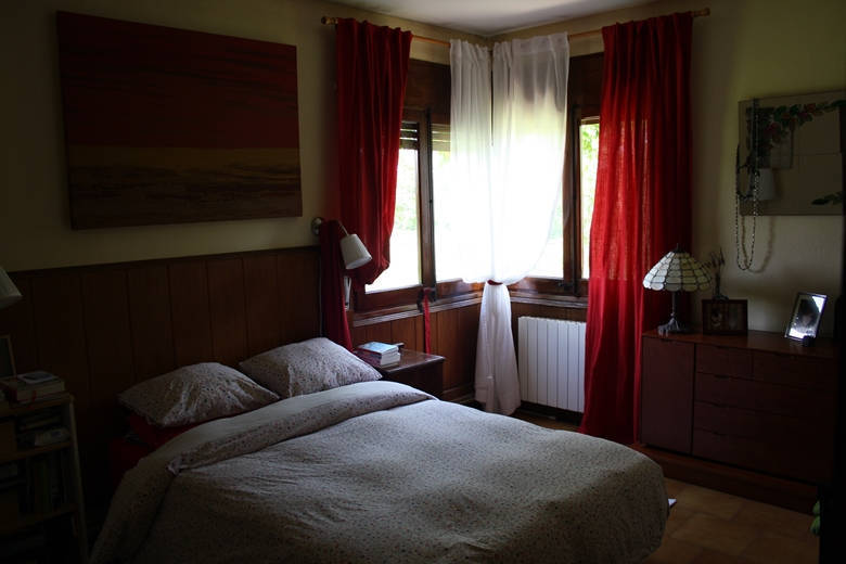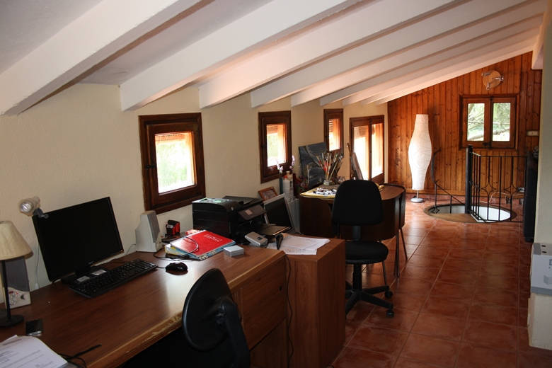На первом этаже просторная гостиная с камином и выходом в сад 50 соток и к бассейну, три спальни, две ванные комнаты и оборудованная кухня-офис.