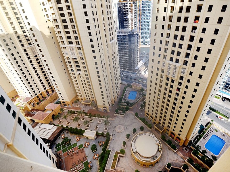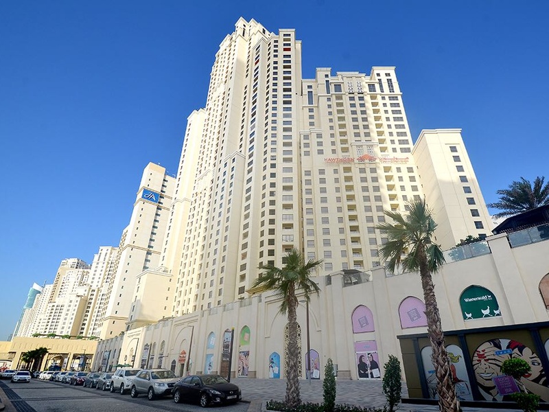 Jumeirah Beach Residence (also known as JBR) is a 1.7 kilometres (1.1 mi) long, 2 square kilometres (0.77 sq mi) gross floor area waterfront community located against the Persian Gulf in Dubai Marina in Dubai, United Arab Emirates. It is a residential development and contains 40 towers (35 are residential and 5 are hotels). JBR can accommodate about 15,000 people, living in its apartments and hotel rooms. The Project has 6,917 apartments, from 900 sq ft (84 m2) studios to 5,500 sq ft (510 m2) penthouses. JBR has a total of six residential blocks, Shams, Amwaj, Rimal, Bahar, Sadaf and Murjan (in order from east to west).