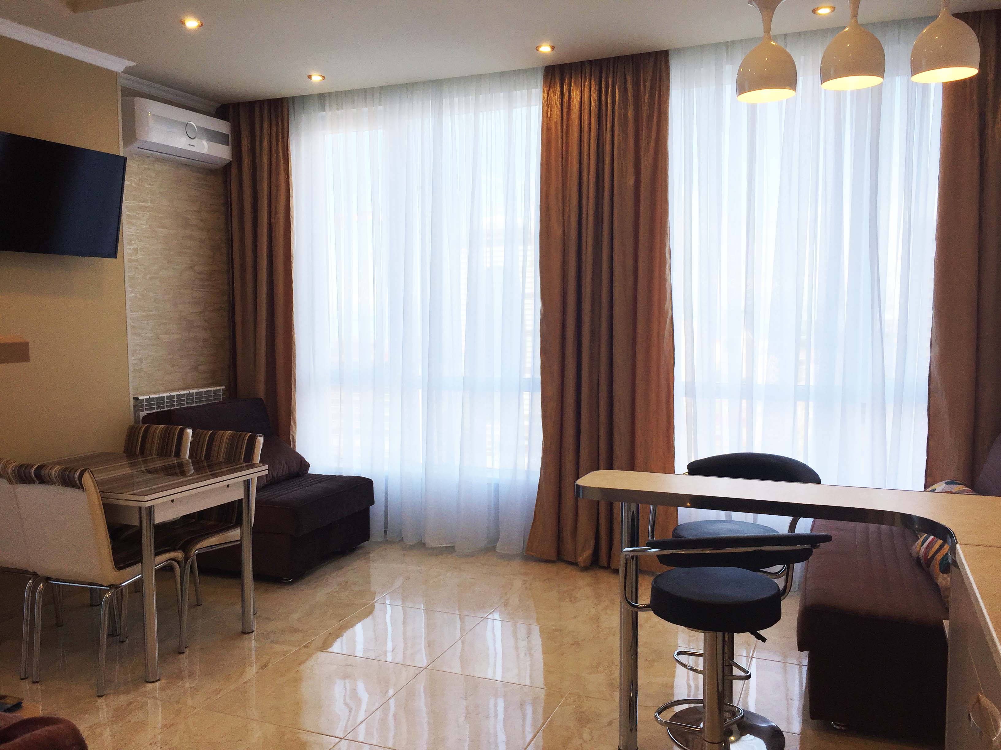 The apartment is 50 sq.m. located. in the heart of the resort life of Batumi, next to the singing fountains, the lake, the Aquapark, the house of Justice, a new international stadium is being built nearby, 10 min. drive to Batumi Airport, 15 min. driving to the border with Turkey. Nearby there are 3 large supermarkets: Yalcin (1 minute), Willmart 3 minutes, Carefour 7 min.) The apartment is located on the 24th floor of a new 25 storey building, which is 5-7 minutes. walk from the sea. From the windows of the apartment offers a magnificent view of the sea and the mountains, as well as the entire panorama of the city. All rooms with panoramic windows and sea views. What is unique for Batumi, which is massively built up by all new high-rise buildings that close the sea view to apartments on lower floors.