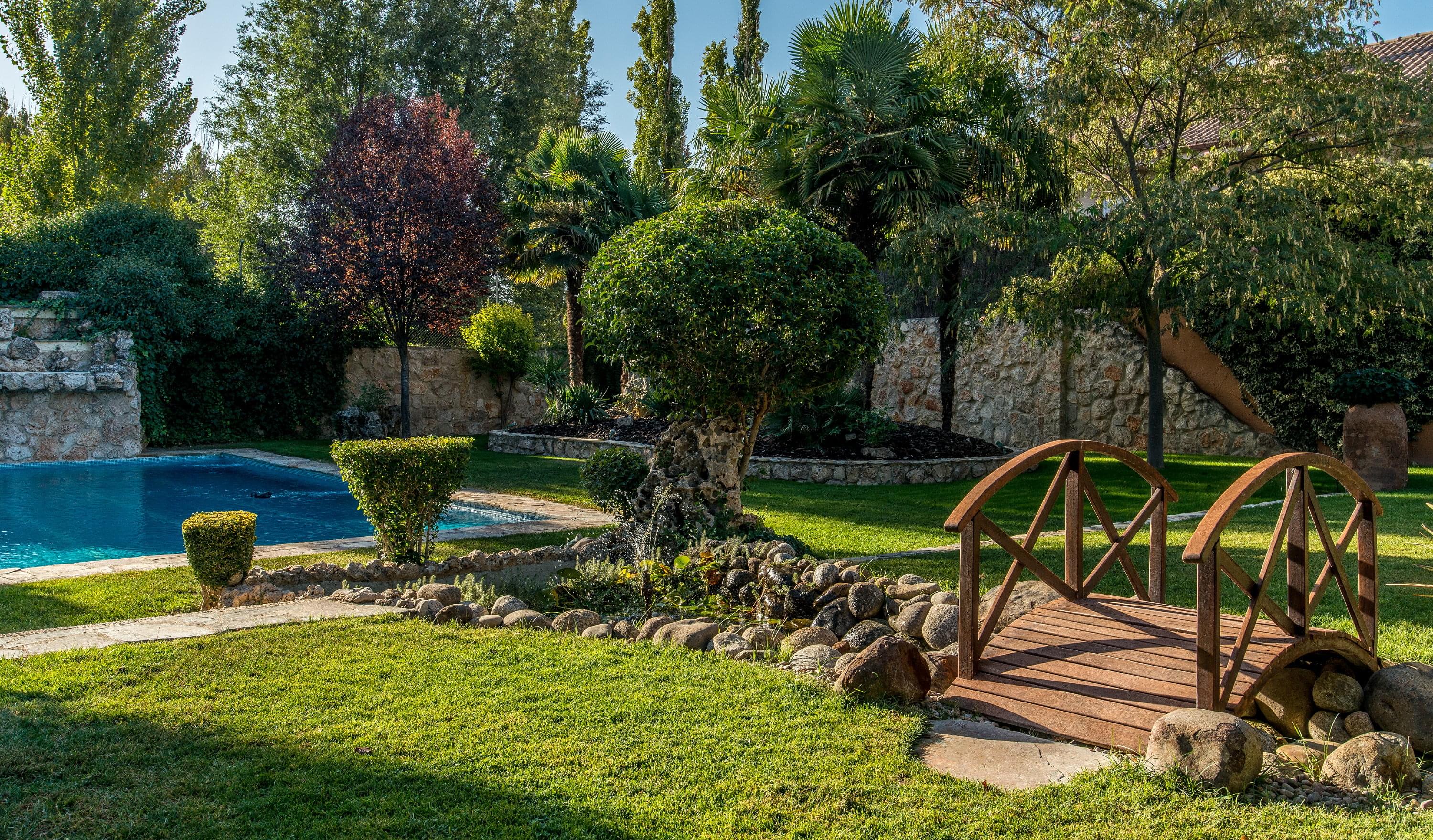 - Двора с парковка для 4 автомобилей, сада, бассейн из природного камня, реки с рыбами, водопада, 3 деревянными мостами, пальмовым островом, кактусами и фруктовыми деревьями, зоны для барбекю, нескольких каминов.
