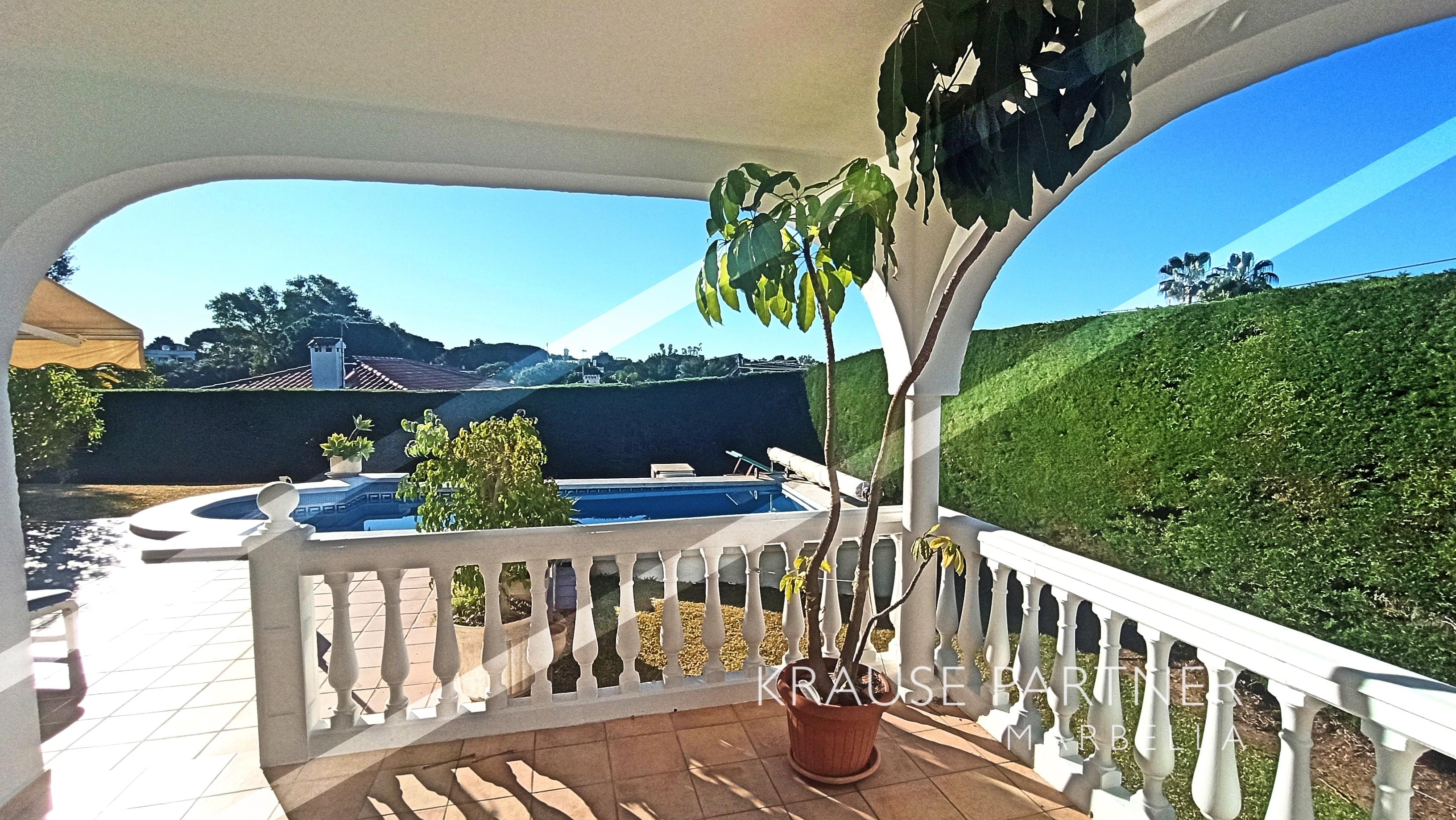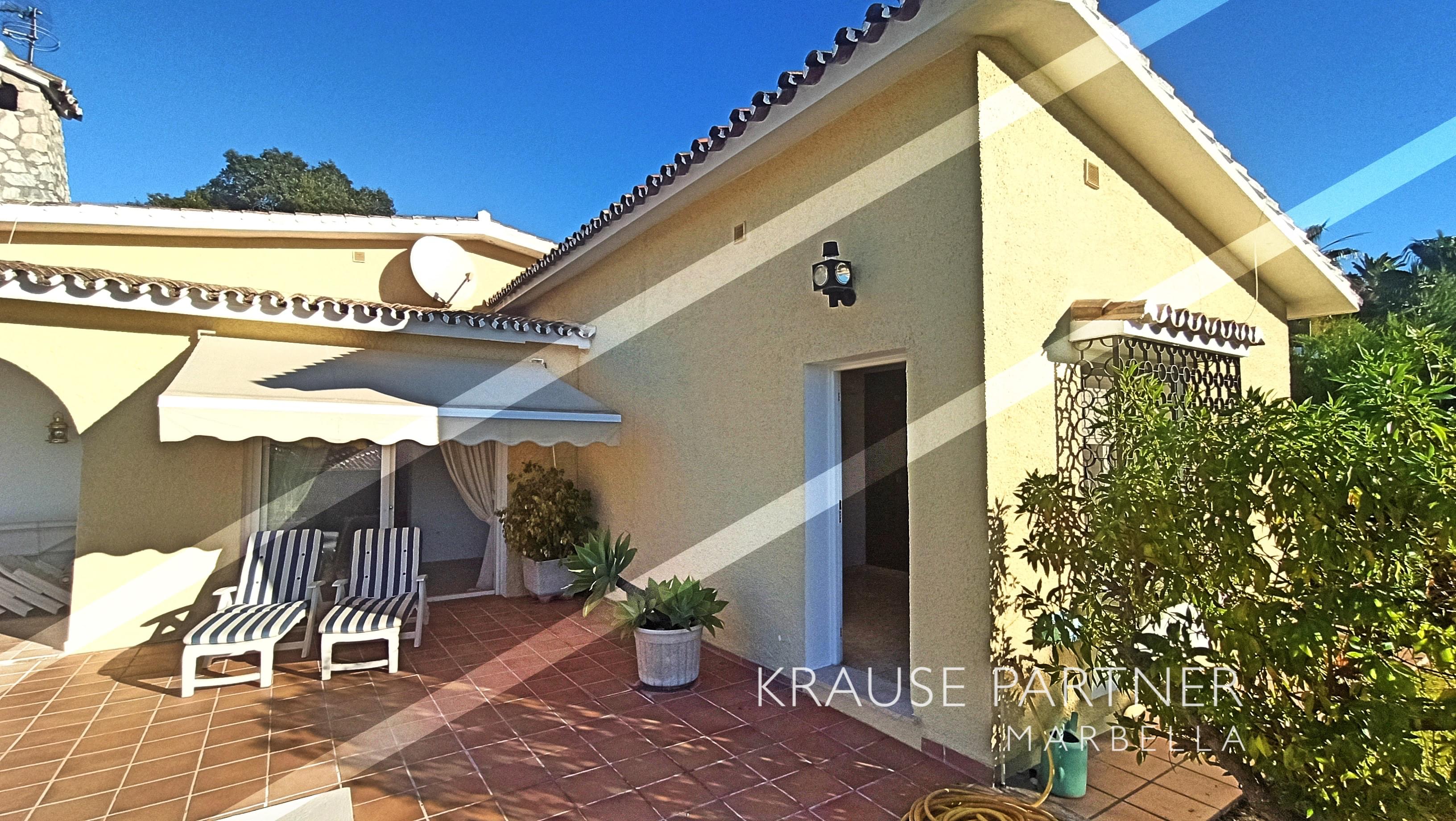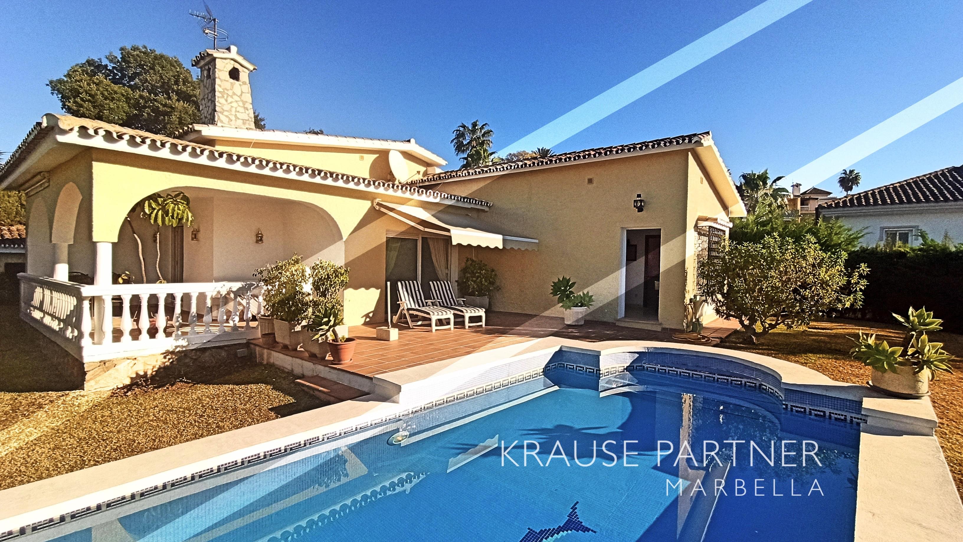 Detached bungalow styled house at the East end of Marbella / Urb. Elviria for sale, 3 bedrooms, 3 bathrooms, salon and dining area, large kitchen, covered terrace, pool with heat pump, privacy, garage. Quite residential area with walking distance to restaurants and shopping center and to the beach...