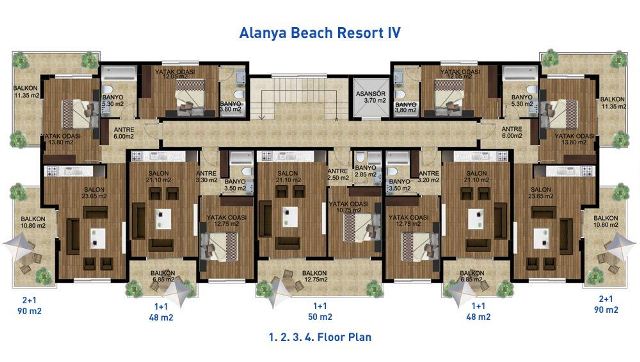 Комплекс «Аланья Бич 4» предлагает множество удобств, таких как бассейн, большой сад, фитнес-центр и сауна, а также, обеспечение безопасности и комфорта.