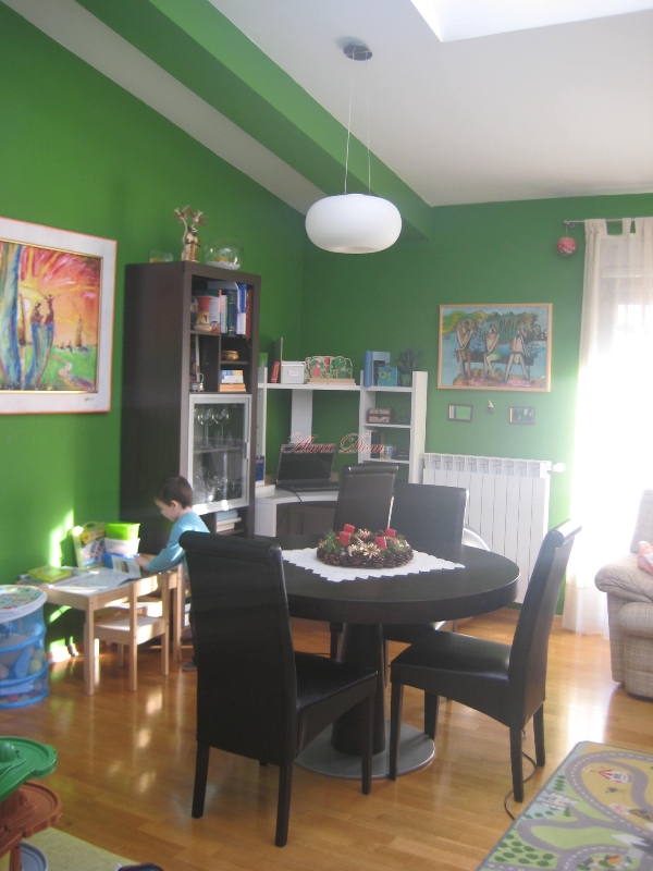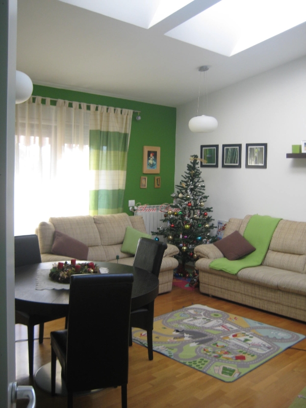 В квартиры высокие скошенные потолки ( в некоторых местах высота потолков достигает более 3 метров), монтированные velux окна в гостиной.
