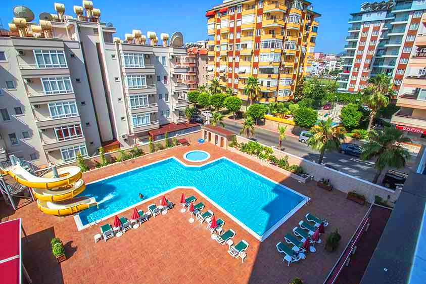 The complex is located in few steps from the famous sandy beach of Cleopatra, among the developed infrastructure of the area.