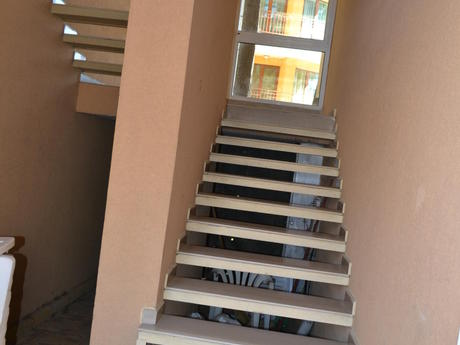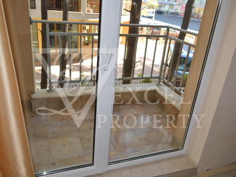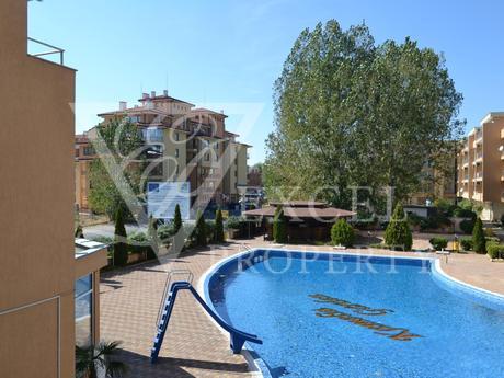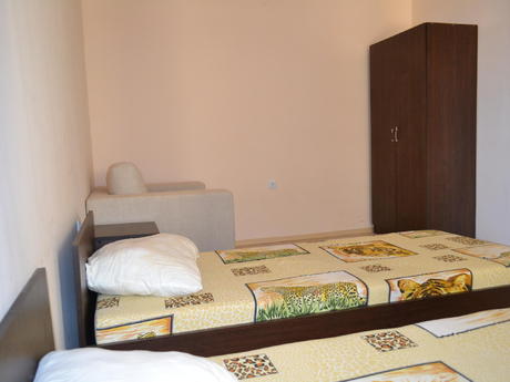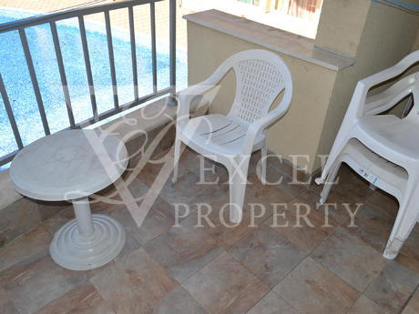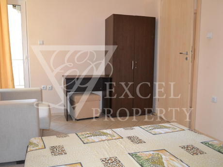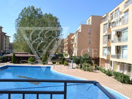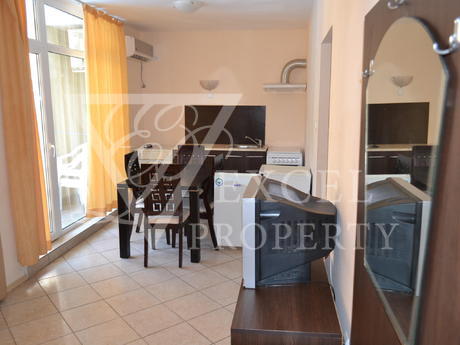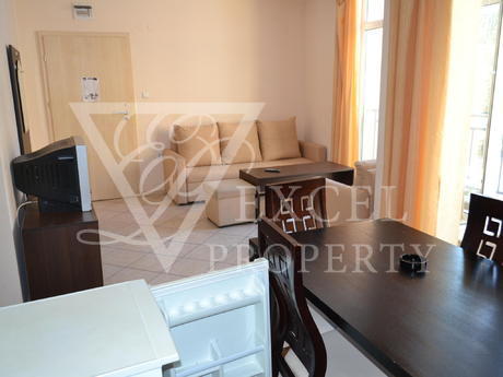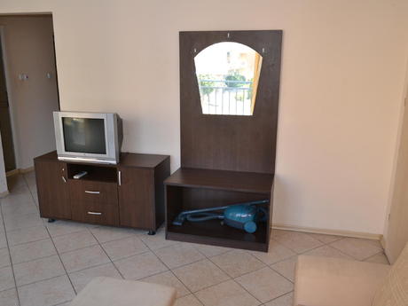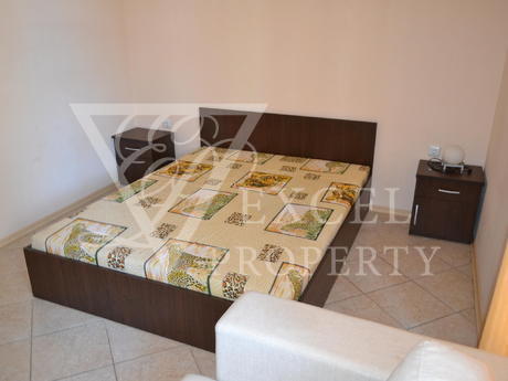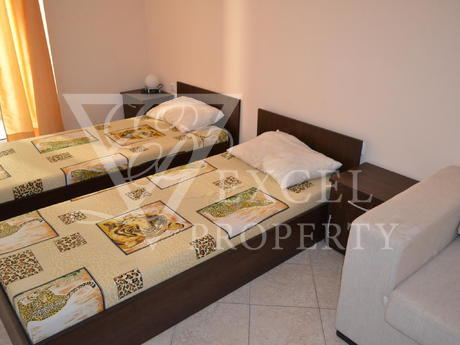 It is fully furnished and has a spacious living room with sofa beds, arm chair, a TV set with a TV, a small kitchen with oven, hob, extractor, fridge and dining table with four chairs. The living room has a west-facing balcony and pool view. The bedroom has a double bed, wardrobe, bedside tables and dressing table. The second bedroom has two separate beds with bedside cabinets, arm chair and wardrobe. There is another balcony that is accessed from both bedrooms. Air conditioning in all three rooms.There are one bathroom and one toilet available. The apartment offers a comfortable stay 6-7 people, and the distance to the sea is about 500 meters. Mladost supermarket is 200 meters from the complex.