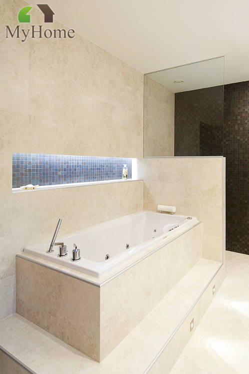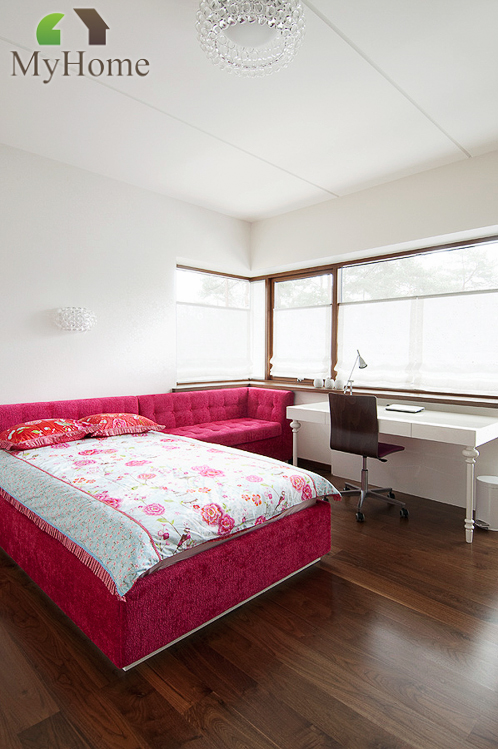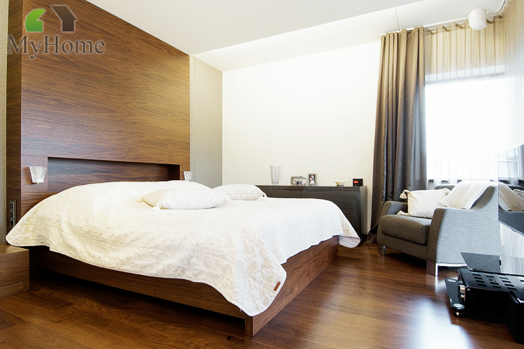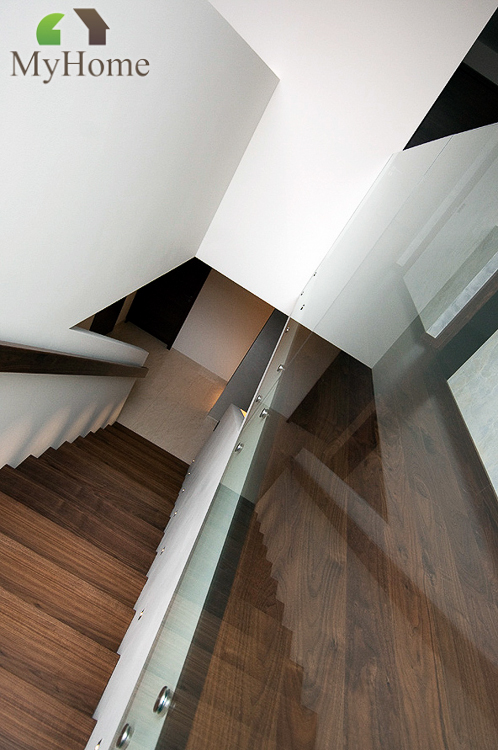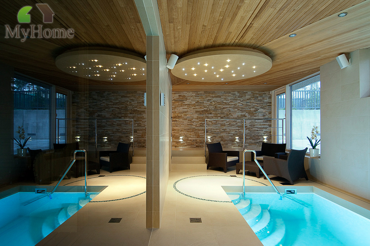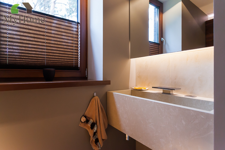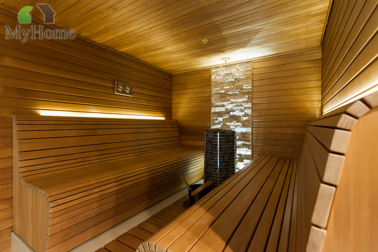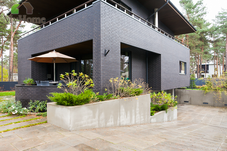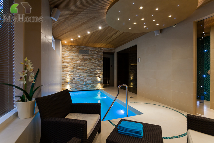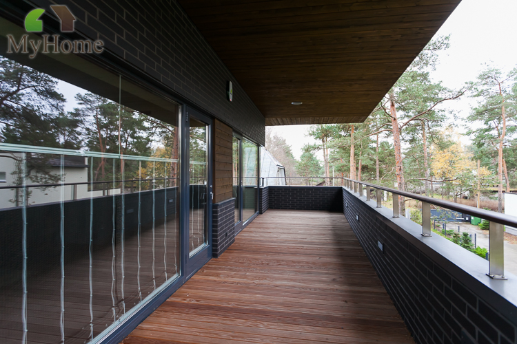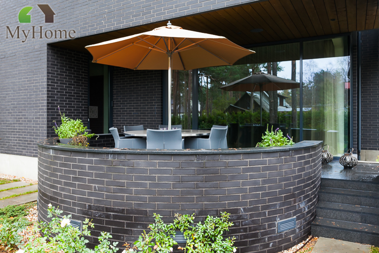 The interior of the whole house is designed with natural materials, from stone to wood; colours are warm and tranquil, giving a slightly oriental impression. The floor on the ground floor is covered with beautiful and practical engraved marble that is easy to clean, leaving no traces on its surface. Thanks to floor heating, the stone does not feel cold under one’s feet. The floors of other rooms are covered with parquet flooring (American walnut). A wood-burning fireplace gives a sense of comfort to the living room; the long stone fireplace shelf gives the impression of luxury. The whole house is decorated with an exotic pattern fragment that can be found on carved wooden closet doors (intarsia technique), engraved into the glass and metal surfaces, and in the plastered rear wall of the restroom on the spa floor; this motif is inspired by the Russian scarf. The basement of the house is as well-lighted as the two floors above, thanks to the architect’s inventive solution to make use of the hollow caused by the ramp by installing floor to ceiling windows. The emphasis of the home spa interior is put on the ceiling and lighting. Although the sauna is heated with electricity, its stones (200 kg) give the same effect as that of a wood-burning sauna heater. A heated ramp leads to the garage. One car can be parked in the garage and there is enough room for storing gardening tools inside. At least two more cars can be parked in the fenced yard.