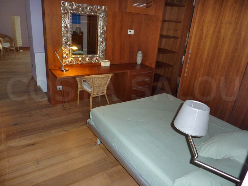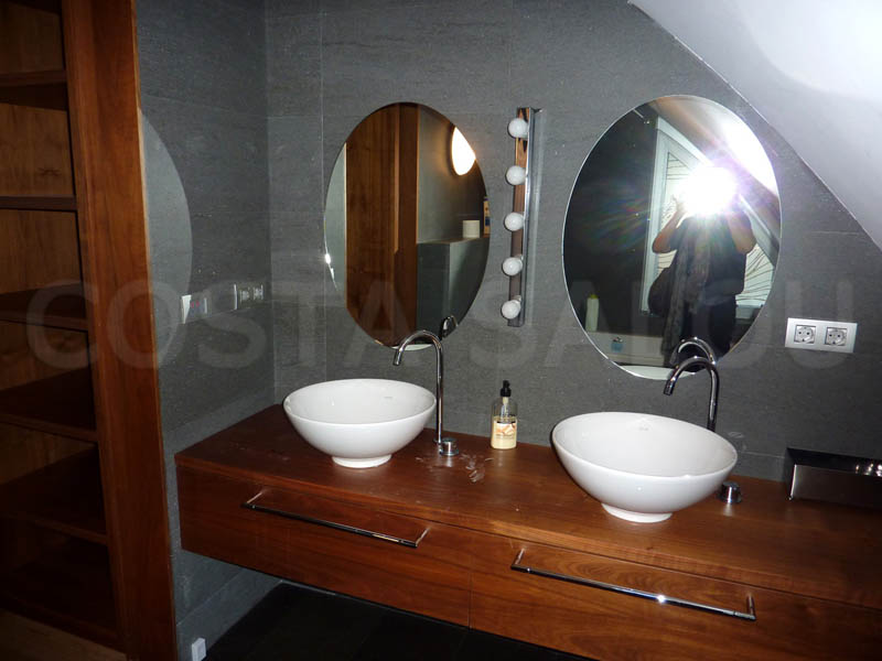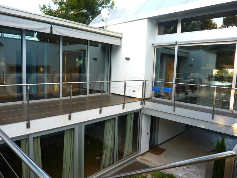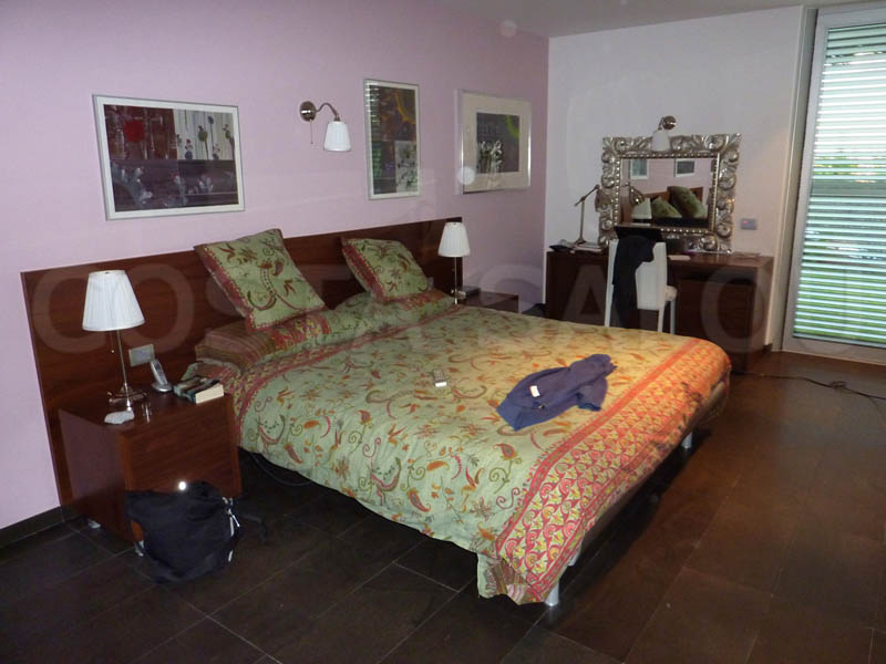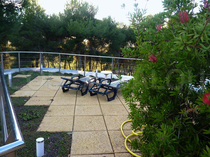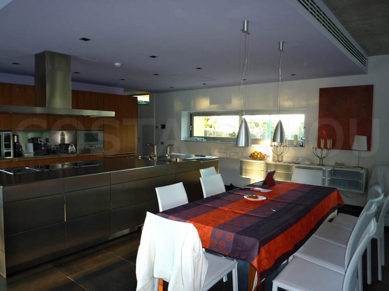 Здание 2-этажное, салон – столовая площадью 60 кв.м, всего 5 спален, 2 из которых объединены с ванными комнатами с гидромассажным душем (типа «сюит»), есть ещё 3 спальни, для которых предусмотрена ванная комната с гидромассажным душем и также ванная комната с видом на бассейн и на сад, террасы общей площадью около 200кв.м. Кроме того в цокольном этаже имеются отдельные апартаменты с ванной комнатой в цокольном этаже для прислуги.  Имеется бассейн, сад, внутренний дворик, гараж на 2-3 автомобиля. Установлено спутниковое телевидение, Wi-Fi, система кондиционирования «тепло – холод», камин. Дом полностью меблирован, оборудован бытовой техникой, оснащён всеми необходимыми принадлежностями для приятного отдыха, есть охранная сигнализация.