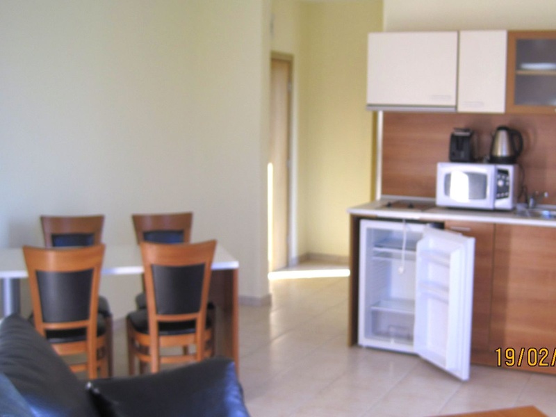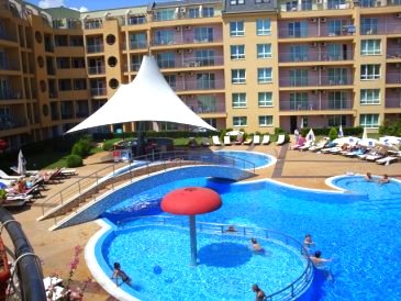 Продаем меблированную двухкомнатную квартиру в одном из лучших комплексов Солнечного берега в 350 м от пляжа Какао Бийч. Комплекс подходит для круглогодичного проживания. Площадь квартиры – 64,4 кв. м. Этаж – 5 (непоследний, лифт работает круглый год). Планировка: прихожая, гостиная с кухней, спальня, балкон, санузел. Акт 16. Годовая такса за обслуживание и охрану - 10,8 евро с НДС