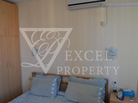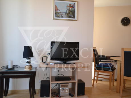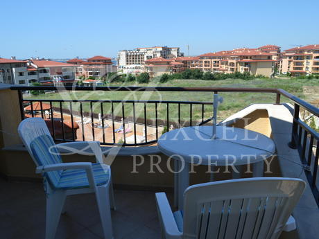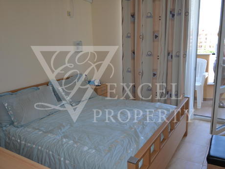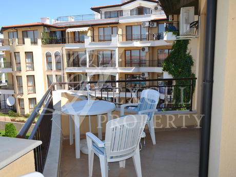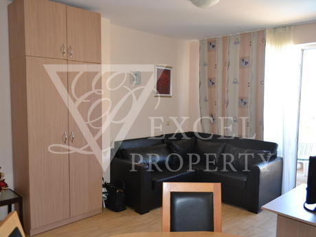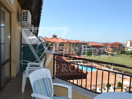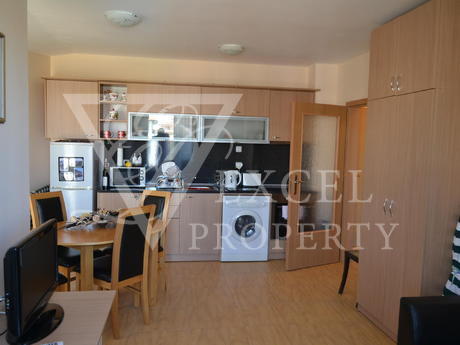Here we offer to you a fully furnished top floor apartment with living area of 61 sq.m. The apartment has an entrance hall a spacious living room, one bedroom, one bathroom and a large balcony with partial sea view and pool view. The price includes all furniture with kitchenette, dining table with four chairs, a big sofa bed, coffee table and TV set in the living room. The bedroom is furnished with a large double bed, bedside tables, wardrobe, dressing table and chair. The price also includes electrical appliances in the kitchen - fridge, oven, hob, extractor, washing machine, microwave, toaster etc. The property has two air conditioners. The balcony has enough space to accommodate table with four chairs. It is west oriented and it is sunny the second half of the day.