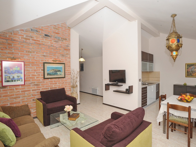 Large living room with kitchenette, sofa, dining table, TV; Bedroom 4: double bed, wardrobe; Bathroom with shower.