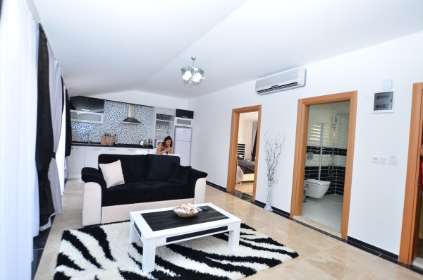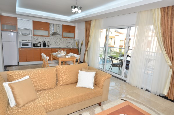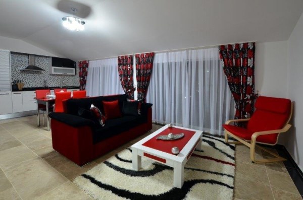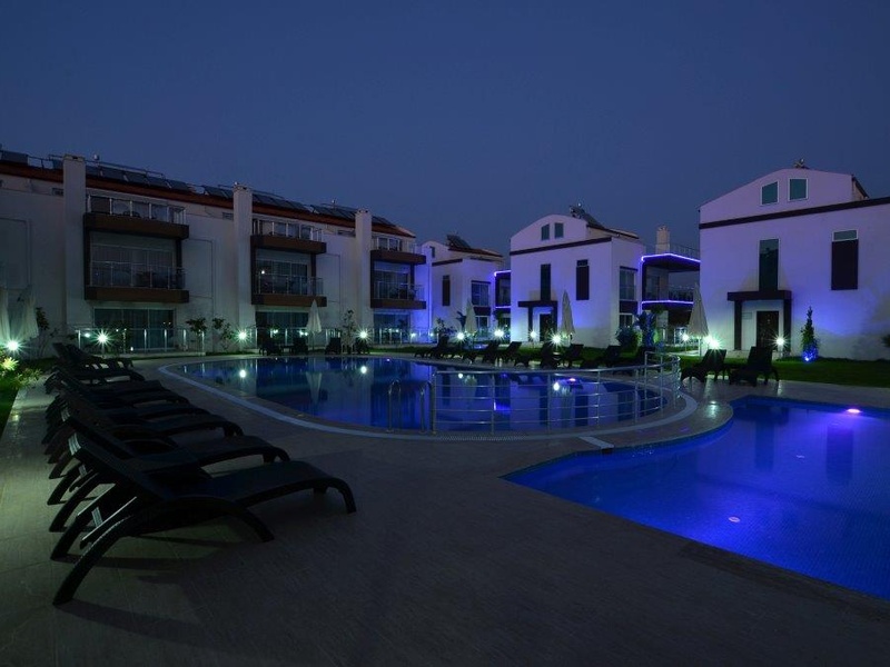 The luxury 21 apartments are innovatively designed residential apart-hotel with elegant and contemporary architecture that captures the spirit with first step inside. The hotel are situated in a superb location and only 250m walk from the seemingly endless and action packed beach of Calis, with plenty of food shops, bar and restaurants within easy reach and a 10 minute walk to the resort centre. The complex is a charming collection of one and two bedroom apartments in separate blocks built around and overlooking a large communal swimming pool that have been thoroughly designed to offer comfortable and intelligent space saving solutions to maximise space and to suit different family needs. Each accomodation unit has a living room with a flat-screen TV, seating area with sofas and floor-to-ceiling windows that open either to a balcony or patio. Well-equipped kitchen comes with an oven, stove and a refrigerator. A microwave, electric kettle and a large dining table are all provided.There is also children’s pool,private parking place and extensive well kept landscaped gardens offering plenty of room to swim, sunbathe, or relax. The large terraces with BBQ overlook the swimming pool with distance mountain view and ideal for alfresco dining on those warm summer evenings. Fethiye city centre is 5 km, Dalaman Airport is 39 km from the complex.