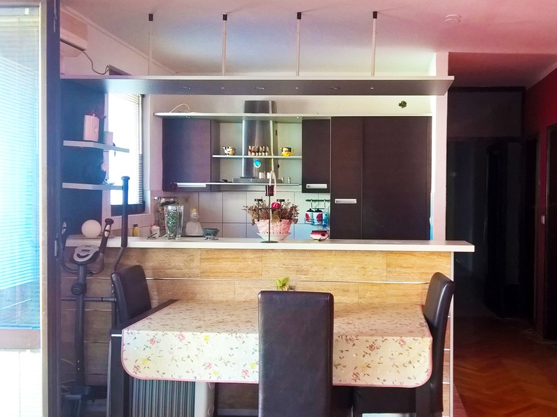 62 sq. meters, 7th floor in 10 store building, with an elevator, Rozino district, center of Budva, near the bus terminal. Nice green neighborhood, a lot of shops, cafes and restaurants. Big inner yard with green trees, a lot of space for kids to play...