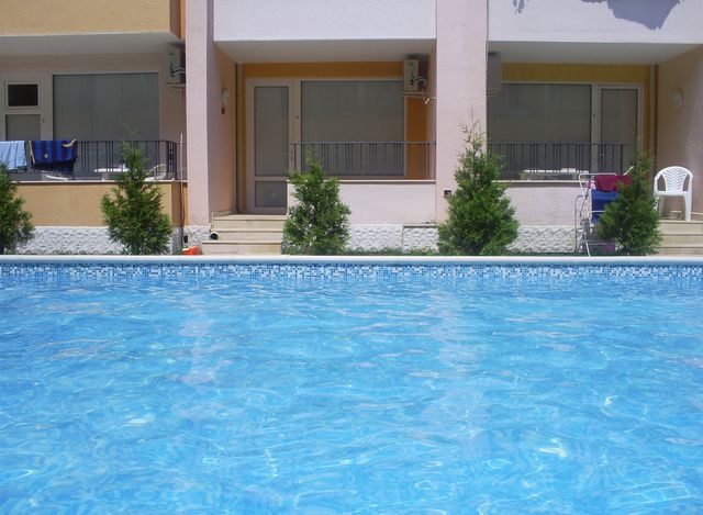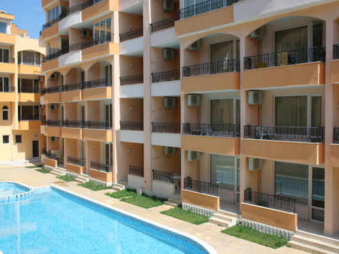 Апартамент в уютном 5-этажном комплексе в Солнечный берег, в 500 м от побережья Черного моря, рядом с аквапарком. Апартаменты меблированы: ванная комната, встроенная кухня, терраса. С террасы вид на басейн, сад и лужайки. В комплексе охрана, парковка, 1 взрослых бассейны, ежедневные развлекательные программы. Рядом пляж и новый коммерческий центр. Возможна покупка с рассрочкой.