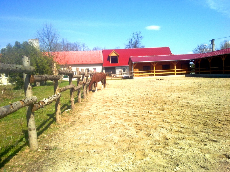 The fourth building - the new, wooden stables for 8 horses, concrete floors, shower box, sedlovnya, side grain storage, enclosed ground for dressage.