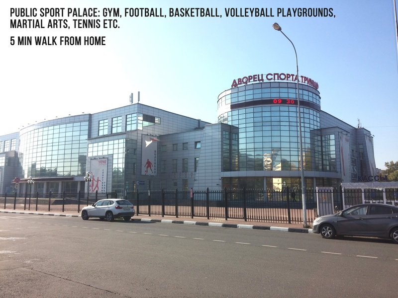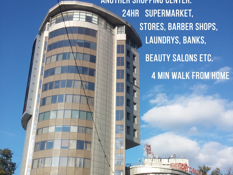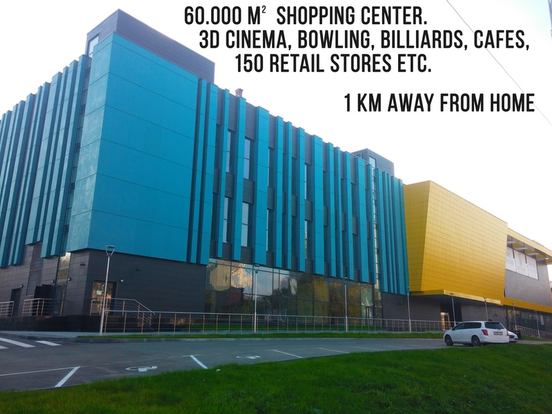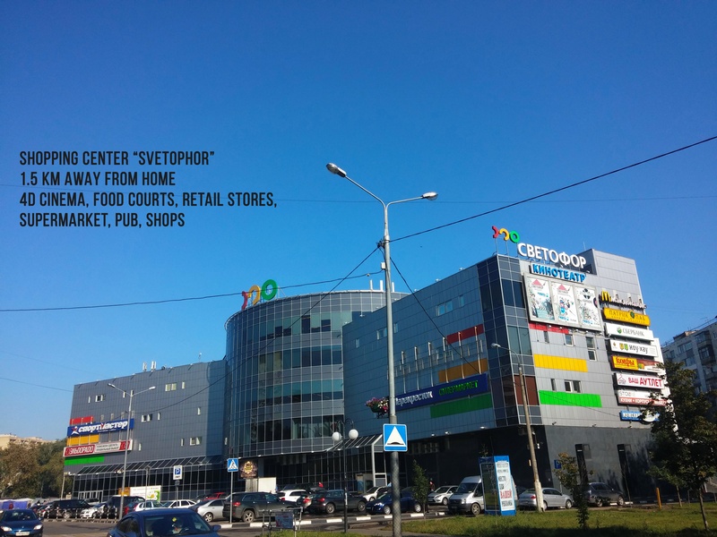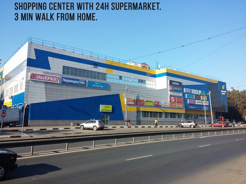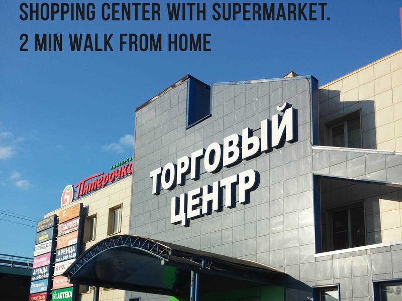+ You will have 3 huge 4-floors shopping centers and 2 supermarkets (Pyatyorochka, Perekryostok 24 hour) within 3-7 min of walk. Also, a newly built giant 60.000sqm 6-floor shopping center "TRC Vikhodnoi" (ТРЦ Выходной) is only 1 km away from the house: over 150 retail stores, 7 cinema halls with 3D, bowling, billiards and other entertaining stuff.