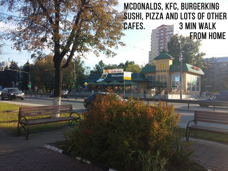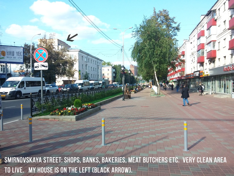 + Smirnovskaya is the central street with a nice clean area where young professionals and middle class families live. Everything you will ever need is here: 7 different banks, a postal office, a big 2-floor eco-marketplace (organic food from Russian farmers), a variety of italian, asian and russian restaurants and cafes of your choice (incl. McDonalds, KFC, BurgerKing). All within a few minutes of walk, no need for car at all.