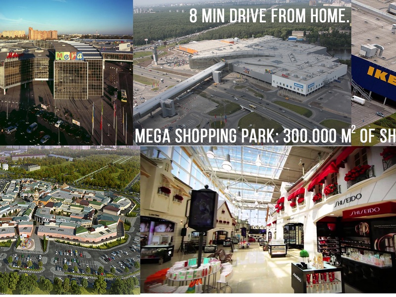 + If middle-sized shopping centers nearby won't satisfy your needs, you can jump on any bus or have a 10-min drive on your car to MEGA-Belaya Dacha shopping park (IKEA, AUCHAN hypermarket, OBI, Leroy Merlin, IMAX cinema etc. +320 retail stores and parking lot for 8500 cars)