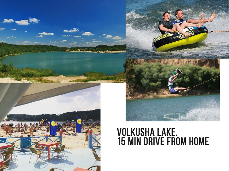 + If you have no room for summer vacation, you can spend your weekend during hot summer days at Volkusha lake, which is located in a peaceful cone forest park 15 min away from the home. It's a great place with a sand beach, clear water with a lot of entertaining activities like zorbs, wakeboard, Jet Skis and blobs.