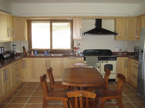 Просторная кухня великолепно обставлены светлой деревянной стены и базовых блоков и гранитной столешницей.