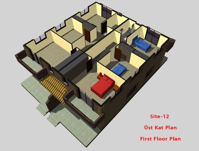 Within the project, there are 30 semi-detached duplex villas and 8 duplex row houses. Semi-detached duplex villas are 145m² big .The villas were designed in a comfortable and useful way. There are three bedrooms, big balconies upstairs and WC& shower downstairs. The villas have got 6 meters long front garden and 8-9 meters long back yard.