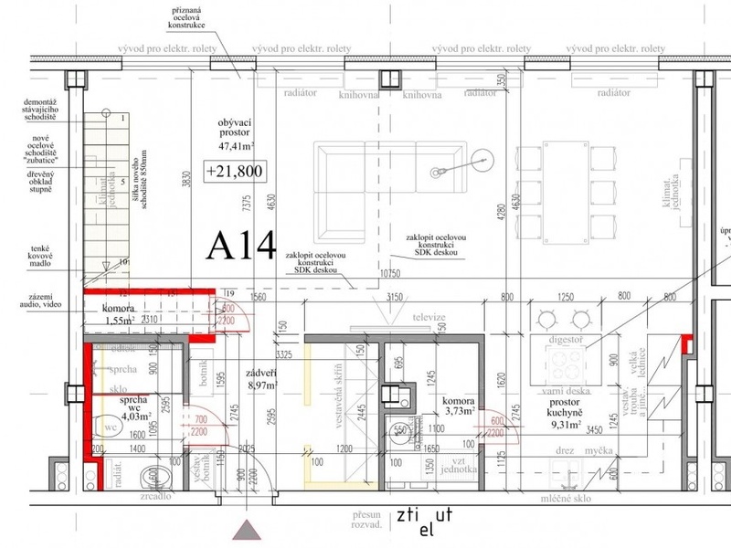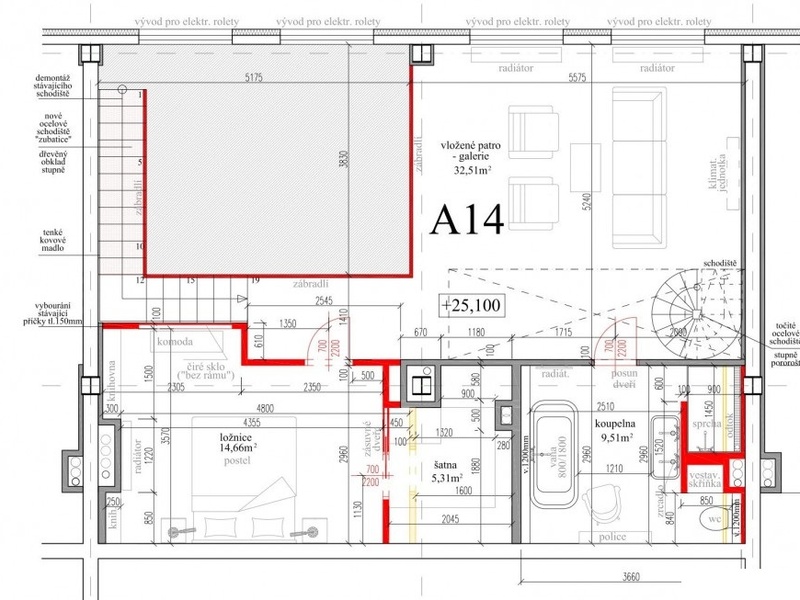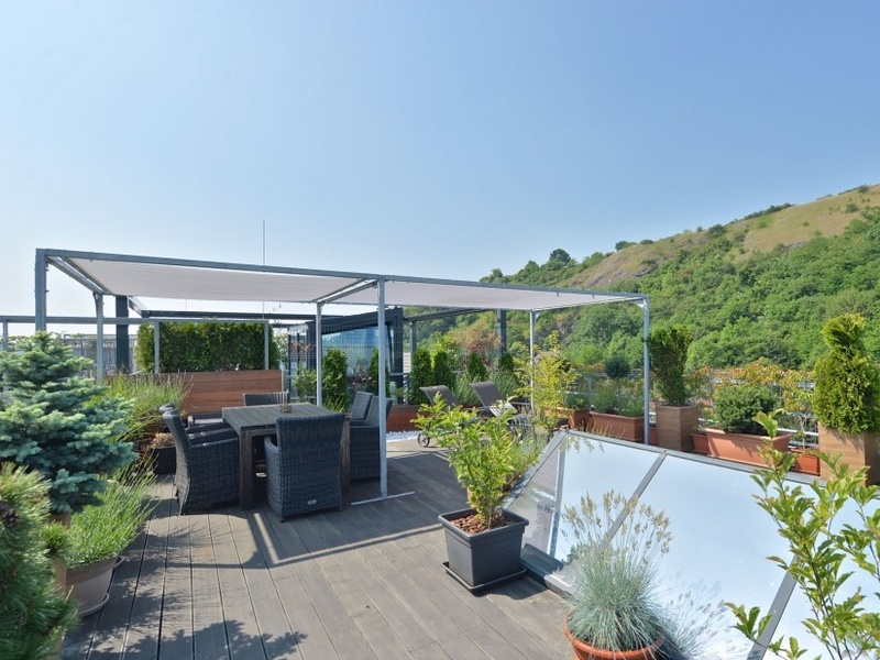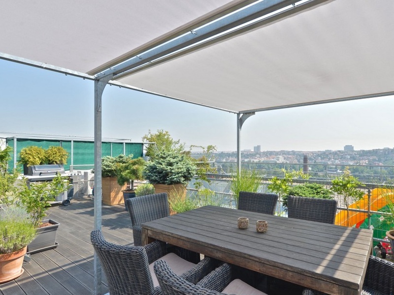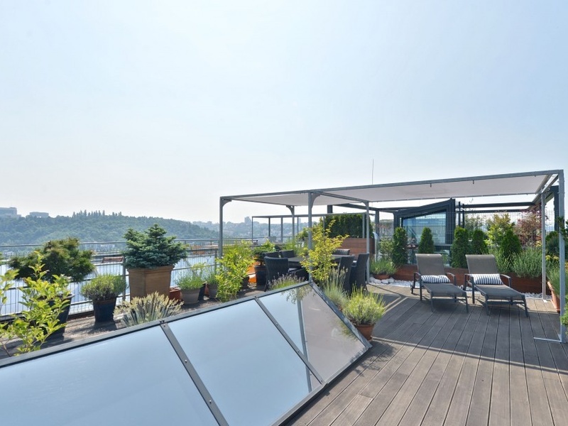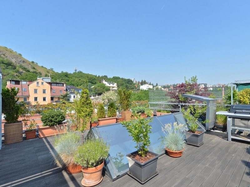 Планировка нижнего уровня квартиры располагает гостиной с полностью оборудованной кухней и обеденной зоной, а также ванной комнатой с душевой кабиной. Верхний уровень пердоставляет зону для отдыха, домашний кабинет, спальню, гардеробную и еще просторную ванную комнату. Терраса на крыше с прекрасным видом на долину реки Влтавы, Вышеград, Подоли, Дивчи Грады и Пражский Град доступна по винтовой лестнице, ведущей из галереи.
