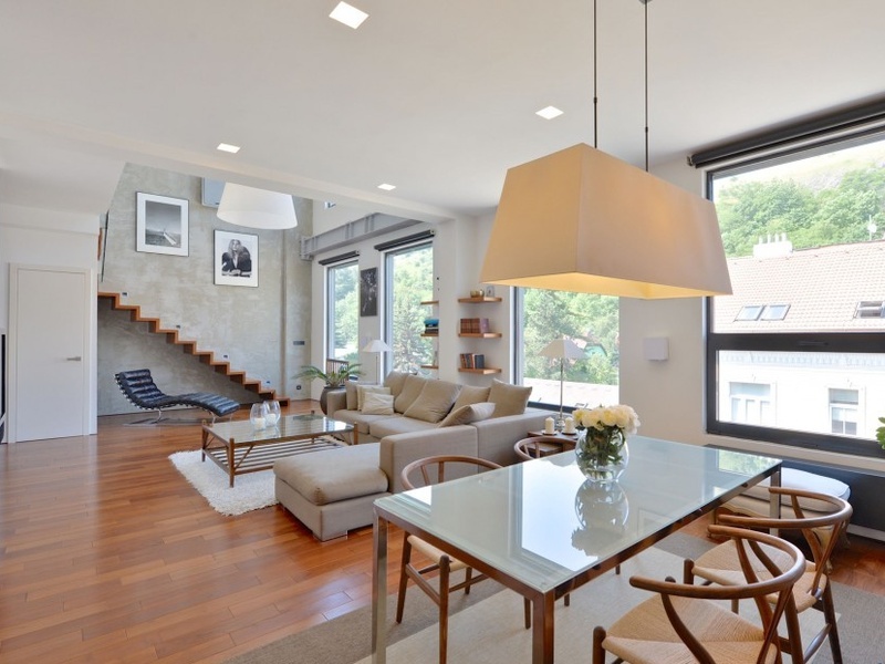 www.abrupt.ru     Продается дорогостояще меблированная квартира-студия в стиле классических нью-йоркских лофтов с большой террасой на крыше и захватывающими видами, открывающимися на город, расположенная на 6-м и 7-м этажах в полностью реконструированном, промышленном здании. Жилой комплекс бывшей типографии имеет титулы от Best International Redevelopment a Best European Interior Design и расположен поблизости от торгового центра Андел, и в то же время недалеко от тихой среды Прокопской долины. Чистое и оригинальное оформление интерьера с высокими потолками ладит с уникальной концепцией целого здания.