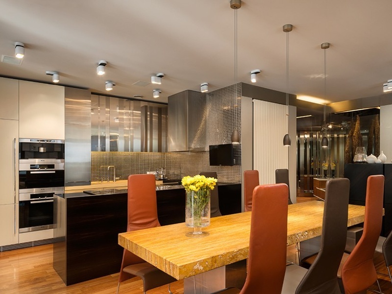 Квартира состоит из открытого пространства гостиной с кухней и столовой зоной, 3-х спален, 2-х ванных комнат, домашнего кабинета и технического помещения. Квартира ориентирована на юг, запад и север, с прекрасными видами, открывающимися из окон, на зеленые насаждения и на окружающие крыши домов.