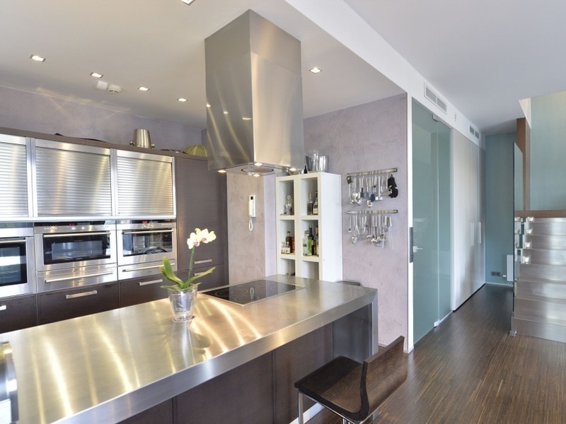 На нижнем уровне квартиры есть открытого плана гостиная комната с полностью оборудованной кухней, столовой и ориентированной на юг террасой, далее туалет и кладовая. Верхний этаж, на который ведет лестница, изготовленная из нержавеющей стали и стекла, предлагает 2 спальни со смежными ванными комнатами.