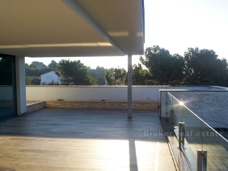 Villa for sale on the beach in Zadar, Zara - a town in Croatia, one of the most important historical centers of Dalmatia, Zadar Archdiocese Department. Located in the central part of the Adriatic coast, the center of Zadar County. The villa is located on the beach, it consists of four floors with a total area of ​​420 m2 (360 m2 of living space). Fully completed all the (repaired), with the exception of sanitary appliances, ceramics, flooring and interior doors. The first floor - the basement is designed as a space for dialogue, where there is a tavern in Dalmatian style with a fireplace, wine cellar, bathroom, toilet and a place to relax (gym, etc.). Second floor - ground floor consists of a garage, a room for technical equipment (central boiler, heating, etc.), bathroom with a short corridor for clothes, living room, dining room, kitchen and space for art. Third floor - a sleeping area consists of two studio apartments with separate dressing room, comfortable bathrooms, and a private bathroom in the hallway and another room with a sea view (three bedrooms). Fourth floor - roof terrace, solarium with jacuzzi 2x2m, a bar and a sauna.