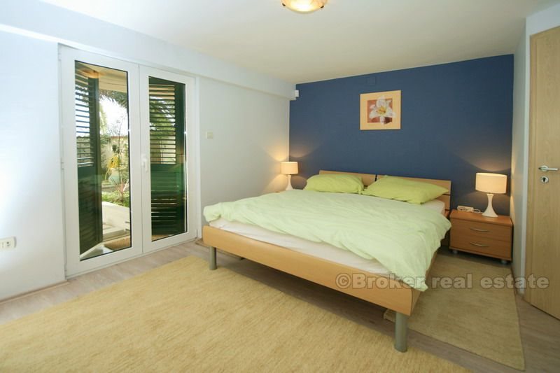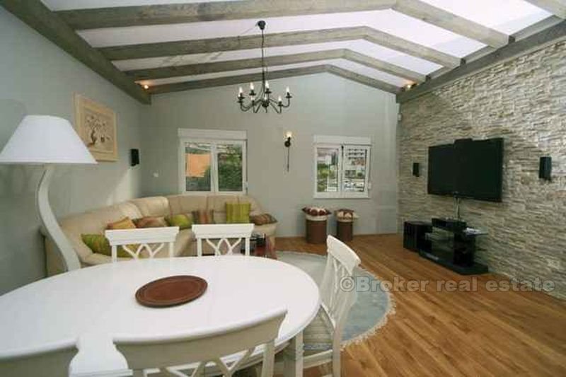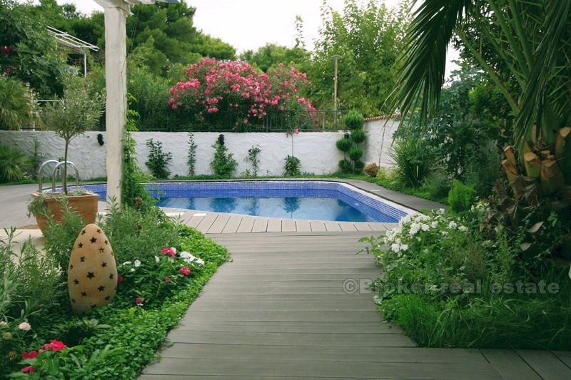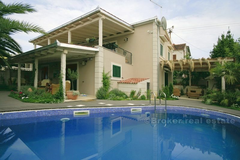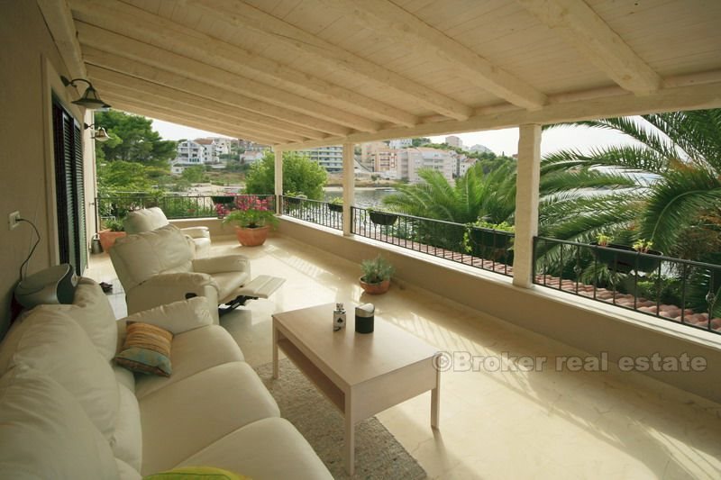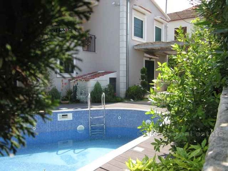 For sale a luxury villa on the island of Ciovo, situated in a picturesque village on the Riviera of Trogir, on the island of Ciovo, 3 km from the UNESCO town of Trogir, and only 5 meters from the sea and sandy beaches. Villa is a successful example of fine and elegant architecture in harmony with the natural habitat to which it belongs. The villa is located along the waterfront with a beautiful sandy beach, in an elegant appearance is dominated by soft tones, wood beams, stone walls and a few details typical of the traditional architecture of Dalmatia. The house is divided into two floors, ground and first floor. It consists of 3 bedrooms, 1 living room for relaxing, 2 bathrooms, 1 toilet and is suitable for 6-10 people. On the ground floor there is air conditioning in the master bedroom with a double bed and a modern bathroom with shower. There are more sedentary and very large air-conditioned rooms with double beds are equipped with LCD satellite TV, air conditioning, as well as a children's room equipment twin bunk beds and a sofa that can be stretched into a comfortable bed for two children. The courtyard is filled with Mediterranean plants, and is equipped with a swimming pool, hot tub, outdoor shower, barbecue. Distance from the sea is 5 m, distance from the town center is 3 km away.