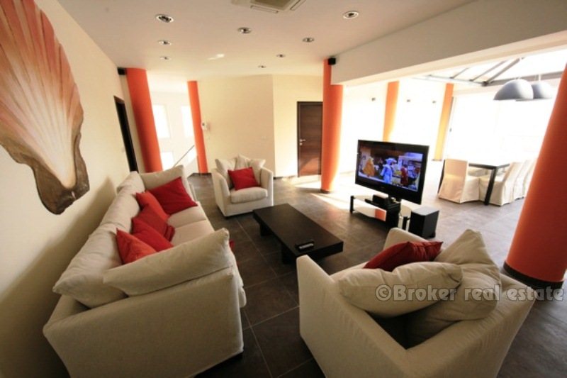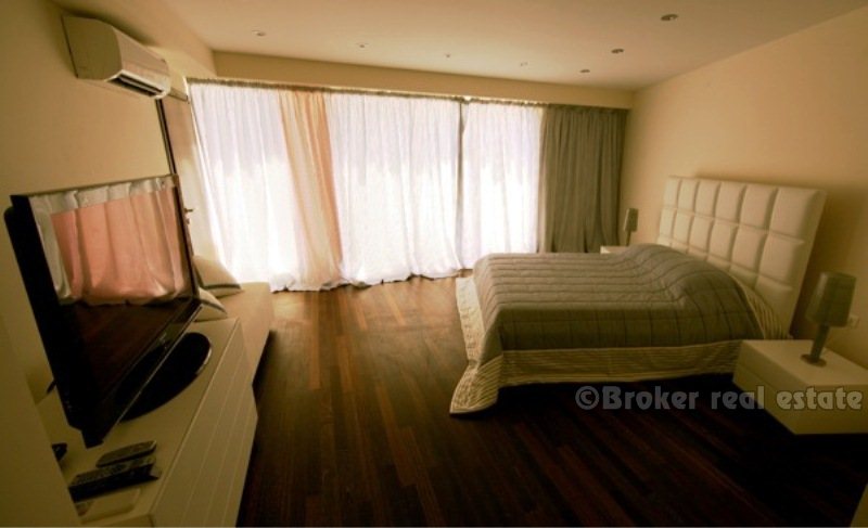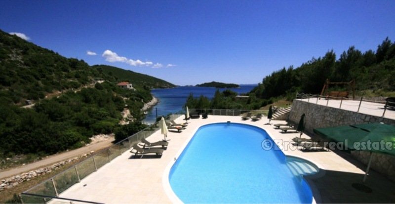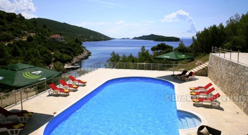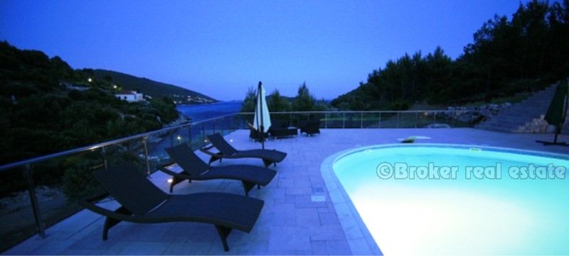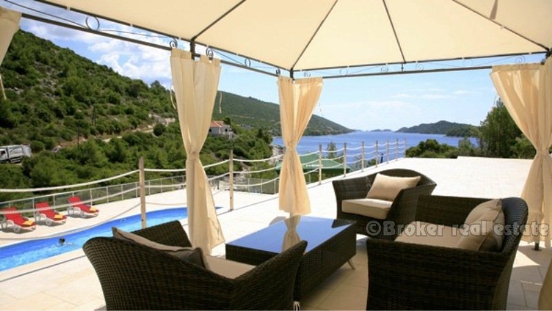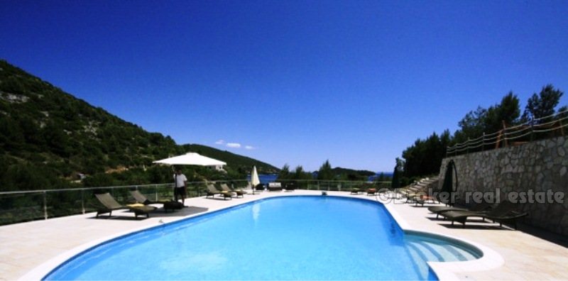 Villa for sale in Korcula island in the Adriatic Sea, in the southern part of Croatia, near the Dalmatian coast. Beautiful new villa in a small bay. Complete confidentiality. The villa is designed, built and located in attractive wooded area, which offers a magnificent sea view 180 degrees over the Adriatic. The living area of ​​the villa 520 sqm, land area of ​​11,400 sq.m .. Inside, there are six bedrooms. Each bedroom has a bathroom with a jacuzzi. There are two large living rooms, one of which is located on the ground floor with large glass windows with magnificent views of the sea, installed underfloor heating. Garage for two cars, and the villa is fully furnished with designer furniture, has a 100sqm swimming pool.