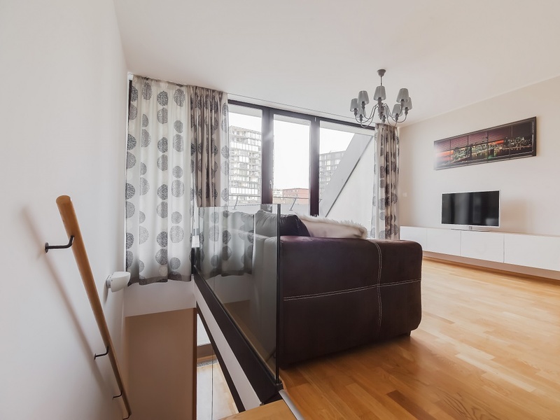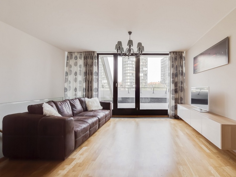 Квартира двухуровневая на 2-3 этажах, общей площадью 117 м2, жилой 88,7 м2, состоит из 2 спальных и ванных комнат, просторной гостиной с кухонной зоной, гардеробной, двух террас общей площадью 15 м2, зимним садом 3,2 м2. Так же в стоимость квартиры входит кладовая в подвале 6 м2 и одно место на парковке. С окон квартиры открывается красивая панорама на Прагу и внутренний дворик с детской площадкой и прудом.