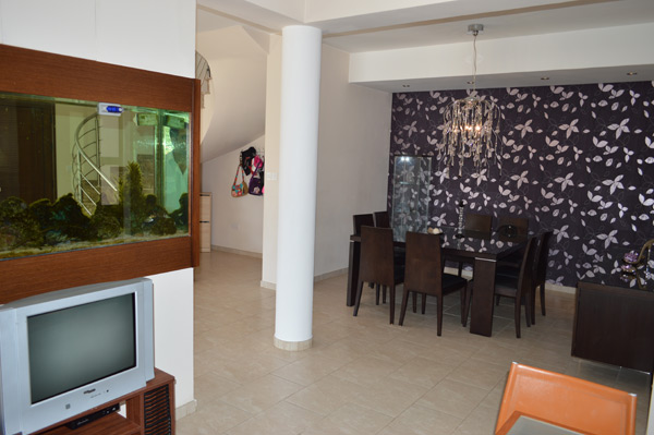 Далее располагается столовая, отличающая интересной деталью – большим аквариумом, встроенным в одну из стен.  Большая кухня открытого плана примыкает к столовой.