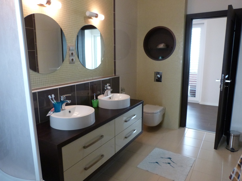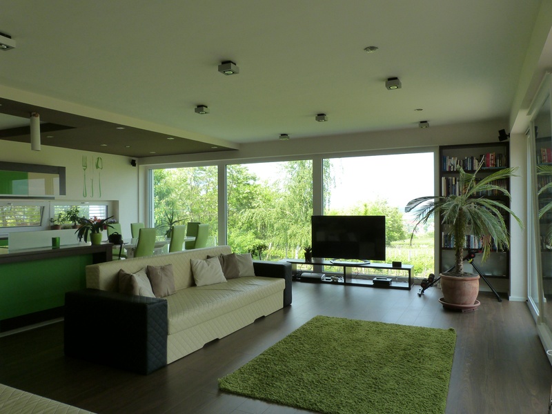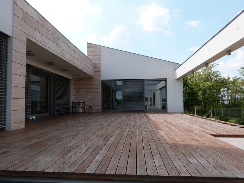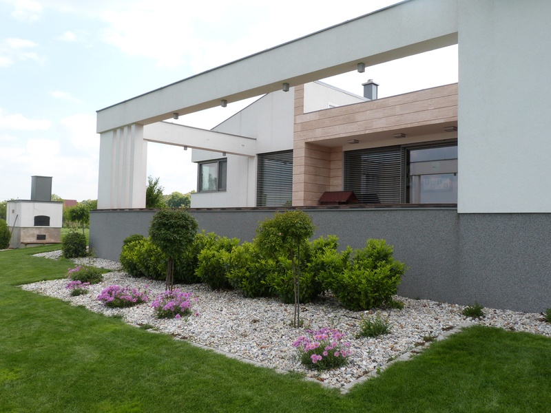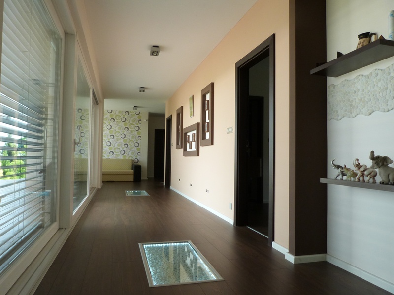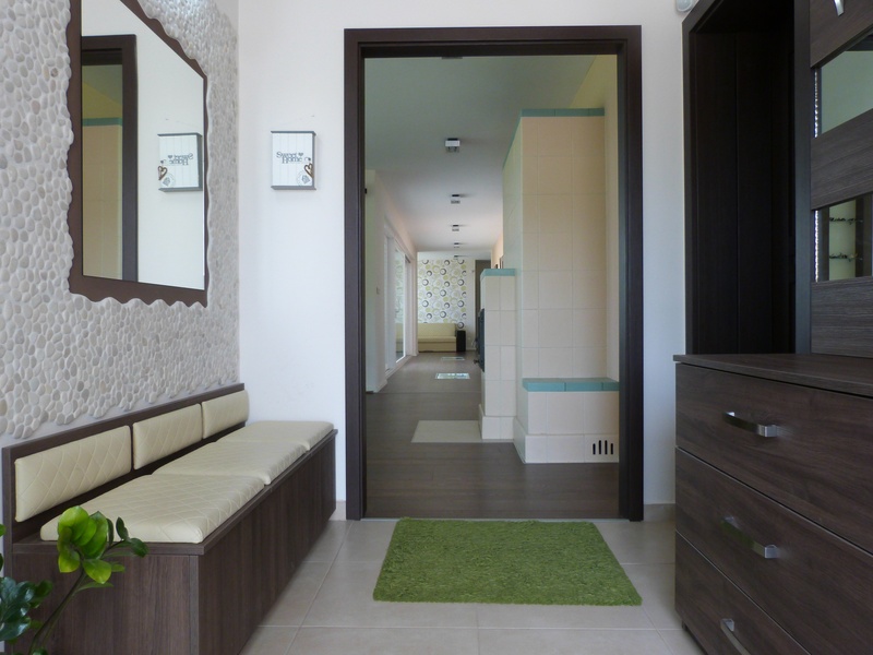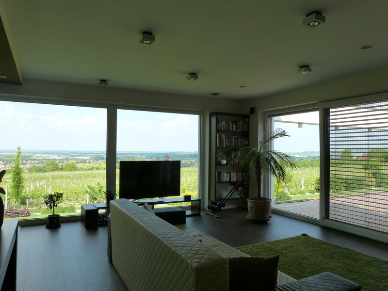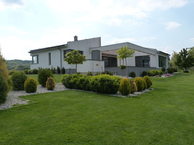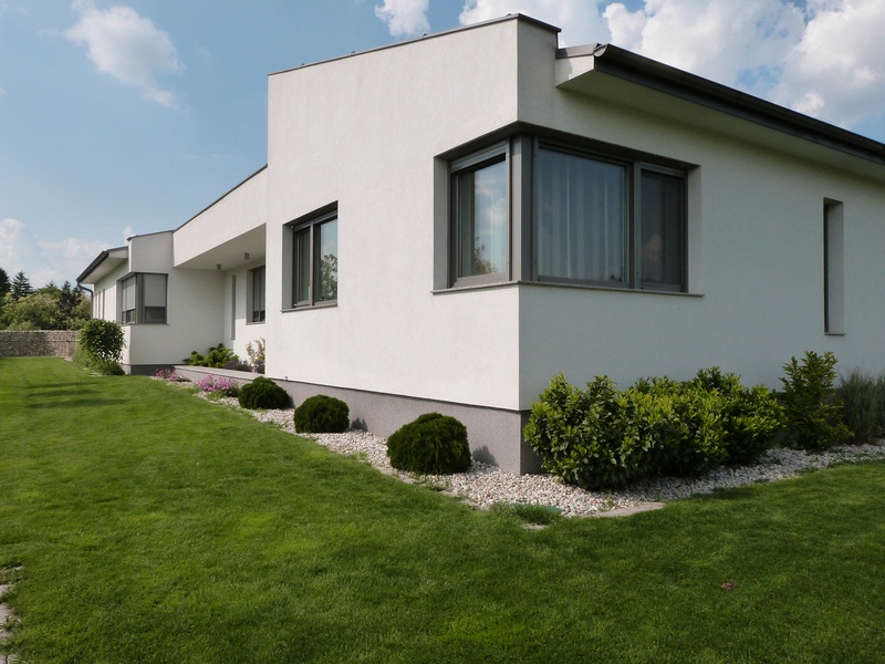 The house was built of Porotherm 30 bricks with an 18 cm graphite Austrotherm thermal insulation layer on it. The windows are made of three layer glass, and each of them has a remotely controlled, insulated shutter or blind (in the living room and the walkway).