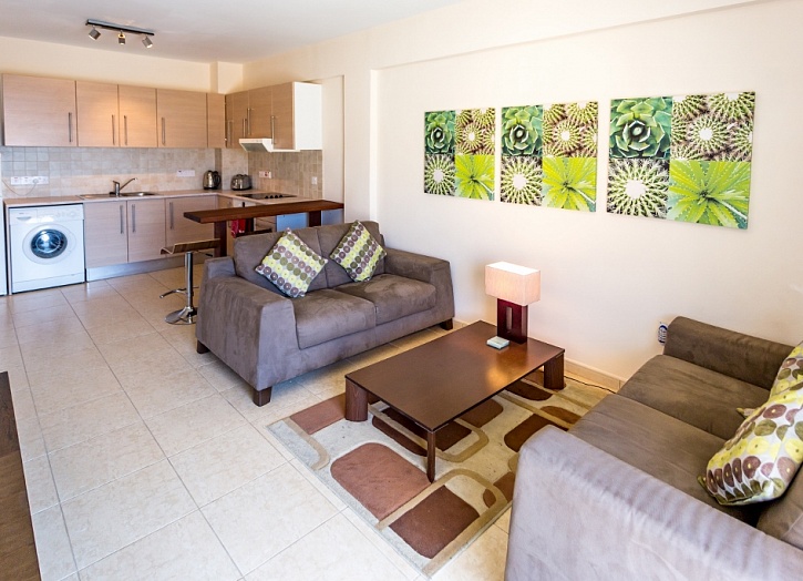Апартаменты состоят из открытого плана кухни, просторной гостиной с выходом на большой крытый балкон с видом на море и бассейн, ванной комнаты и спальни с встроенными шкафами.