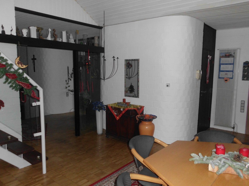 An up to the gable-reaching and oriented in SOUTHEAST direction picture window floods the three-level central dining, cooking, living and gallery area with sunlight. The interplay of its brickwork with real wood flooring create a good balance between living and objectivity, the freestanding kitchen island provides a visual / functional boundary between the dining area and the neighboring economic area the second level. The business area includes a pantry, heating and drying room and provides access to the garden and garage.