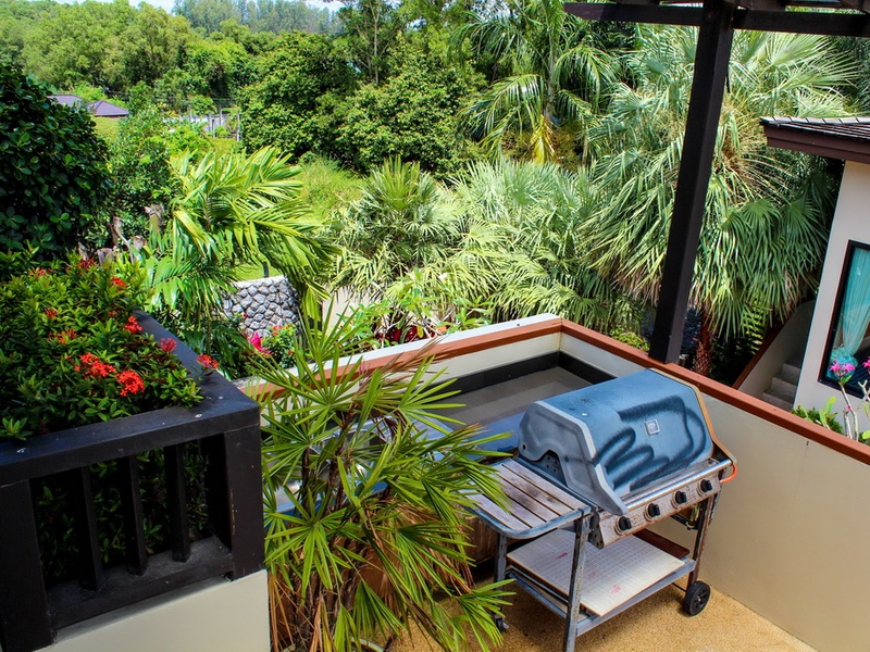 European kitchen, dining room with wooden table and an open plan living area. On the terrace - barbecue and beautiful tropical gardens.