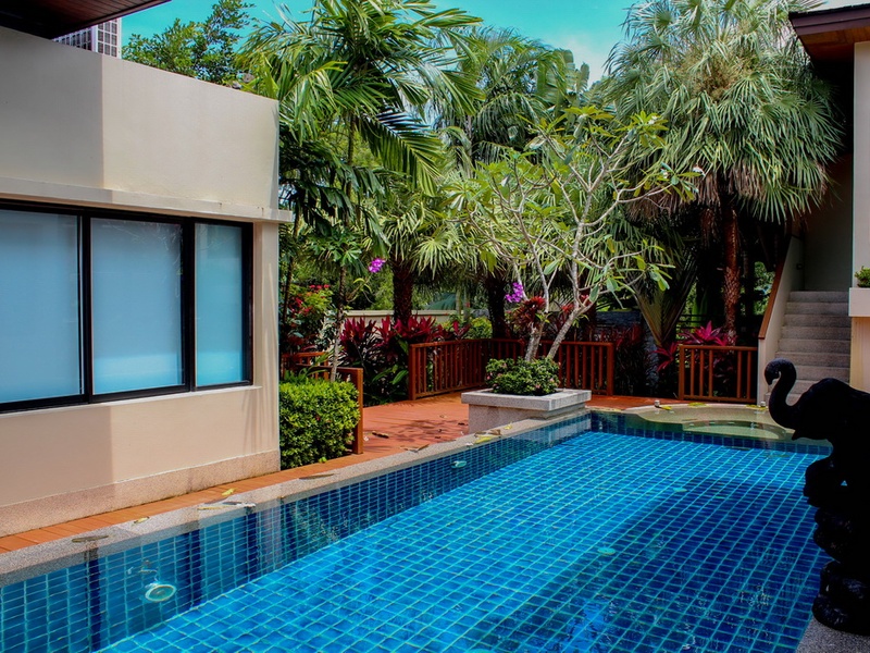 Luxury villa with pool in a Balinese style, combining modern design with traditional Thai architectural features. This house makes an impression at first sight: a massive wooden doors, a tropical garden and a terrace, a wooden dining table and a harmonious elegant furniture. From all the bedrooms and the living room has a beautiful view of the pool, giving the villa an atmosphere of lightness, freshness and relaxation.