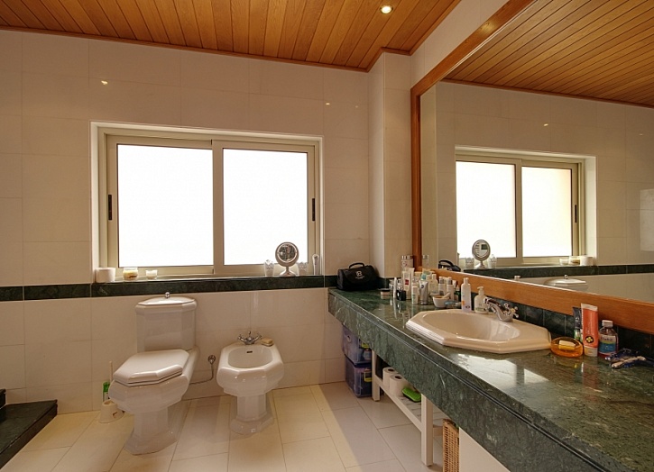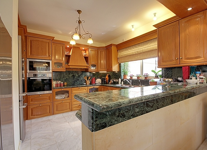 Дом оснащен кондиционерами и полами с подогревом. В окнах - стеклопакеты с двойным остеклением, паркет в спальнях, в гостиной и столовой - мраморные полы, потолки – с отделкой натуральным дубом, в кухне и ванных комнатах - столешницы из мрамора. В доме мраморные лестницы, подсобные помещения, прачечная, кабинет с душевой кабиной, 2 гардеробные комнаты для хранения обуви и одежды, котельная, гараж на 2 автомобиля.