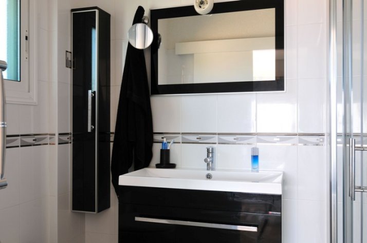 Входная дверь ведет в просторный холл и дальше - в гостиную. На этом уровне располагаются 3 спальни с индивидуальными ванными комнатами и семейная ванная комната. Все спальни имеют великолепный вид на море и выход на общую веранду. Также на этом уровне расположены просторная гостиная с выходом к бассейну, столовая и кухня Ferrari.