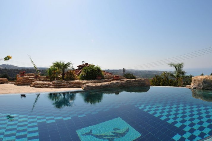 Двухуровневый бассейн с водопадом расположен в нижнем саду, здесь же имеется большая беседка с видом на закат.